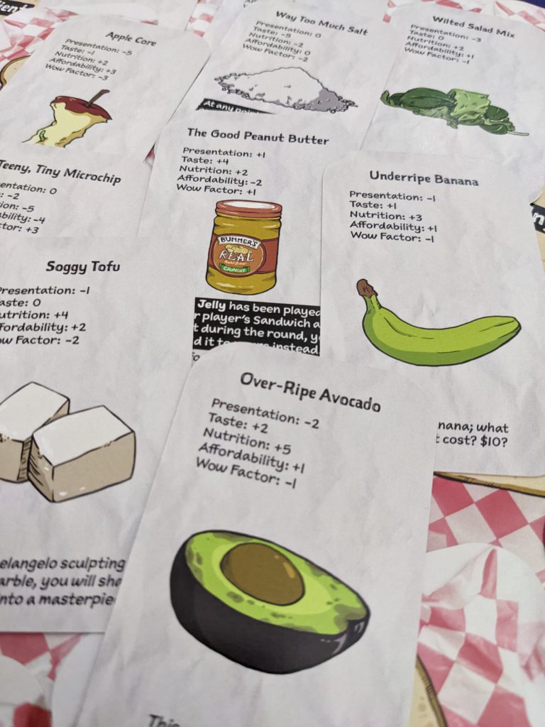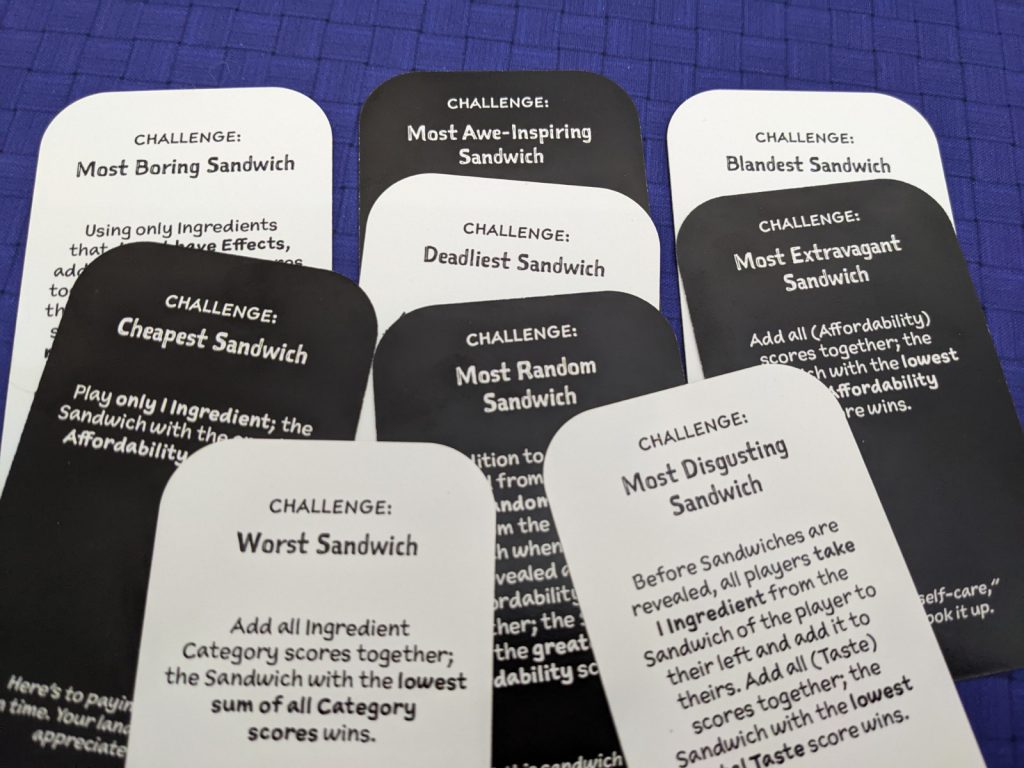 Because sandwiches don’t have to be savory or delicious to win. They don’t even have to resemble sandwiches thanks to 10 double-sided Challenge Cards which dictate what kind of sandwiches to make. Challenge Cards are won each round by the player who best meets their scoring requirements. They read like strange superlatives from a high school yearbook: Best Sandwich or Worst Sandwich. Most Practical. Blandest. Most Glamorous. Most Disgusting.