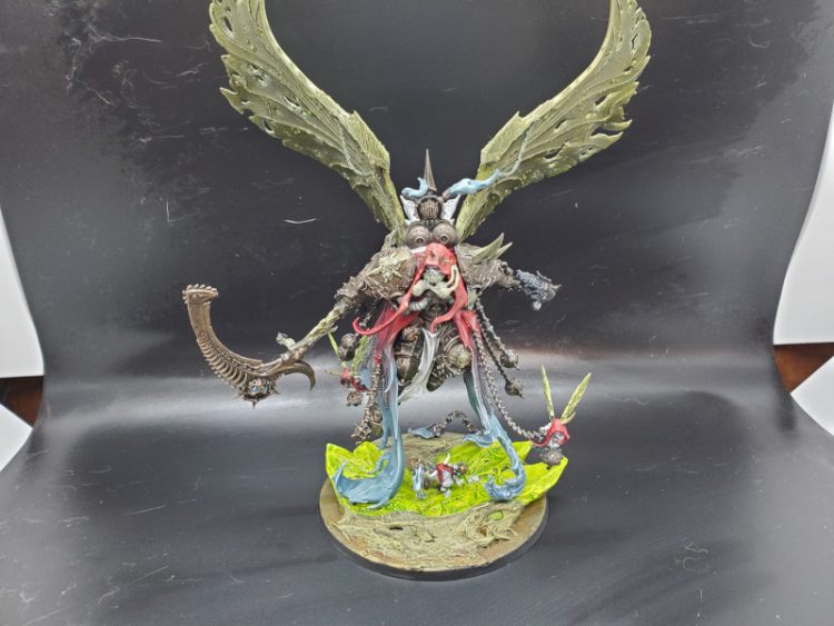 The Demon Primarch Mortarion flies over the battlefield on massive moth-like daemon wings. Like his sons he spreads disease simply through his presence on the battlefield; lesser enemies will succumb to plague before getting close enough to scratch his armor (not that they could). He is clad in Barbarus Plate he made himself, and wields a scythe and plasma pistol with deadly ease. Fully sworn to Nurgle, Mortarion has been reborn as a demon prince. He was not always this way, however.