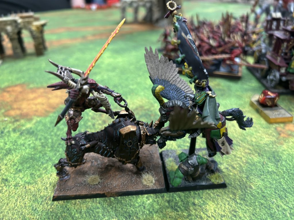 Slaanesh in general can make a pretty impressive Chariot list. The Seeker Chariot is the last option on this list for She Who Thirsts. At 100 points per model and the ability to be taken in units of 3, Seeker Chariots sacrifice a lot of damage potential (dropping down to d3+1 impact hits) for Open Order allowing them to pivot more freely as they race around the table.