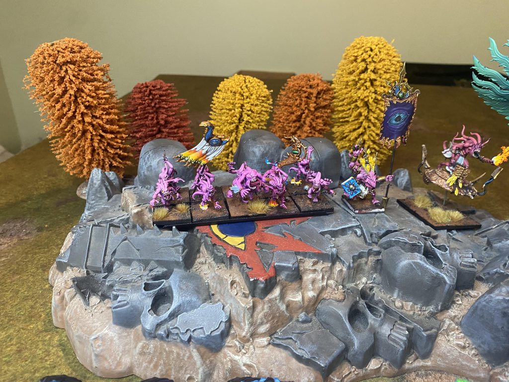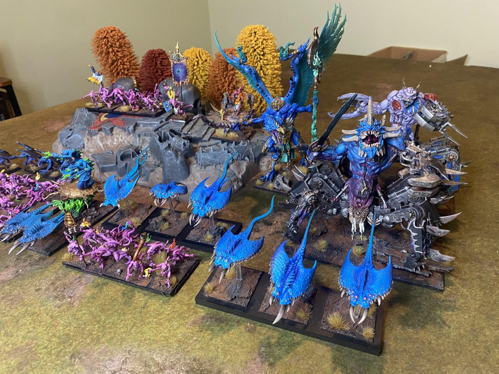 The Forces of Tzeentch arrayed for war. Credit: Danny McDonaldGift of Mutation (Tzeentch): A 12 inch Hex with a minimum casting value of 8+. If this spell is cast a a value of 8-11, the target enemy unit suffers a -D3 modifier to either Strength, Weapon Skill, or Toughness. If the spell is cast at a 12 or higher, you may select 2 of these characteristics to reduce instead (to a minimum of 1).