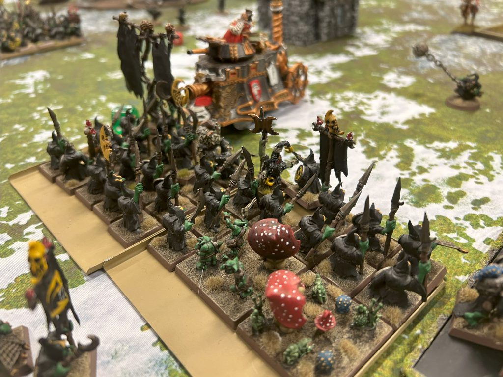 This steam tank has only struck 4 of these night goblins, but in the Old World the entire front rank will get their chance to stabby stab it.