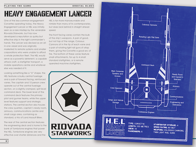 Every Orbital Blues campaign we spoke to was like, “Yeah, we named our game after the ship.” That's the thing for all those media as well. The Bebop, Firefly, both named after the spaceship. We wanted to give people more tools and more ability to make those spaceships and come up with personalities for them. It's kind of like a character creation book for the fifth member of your party with four people in it.