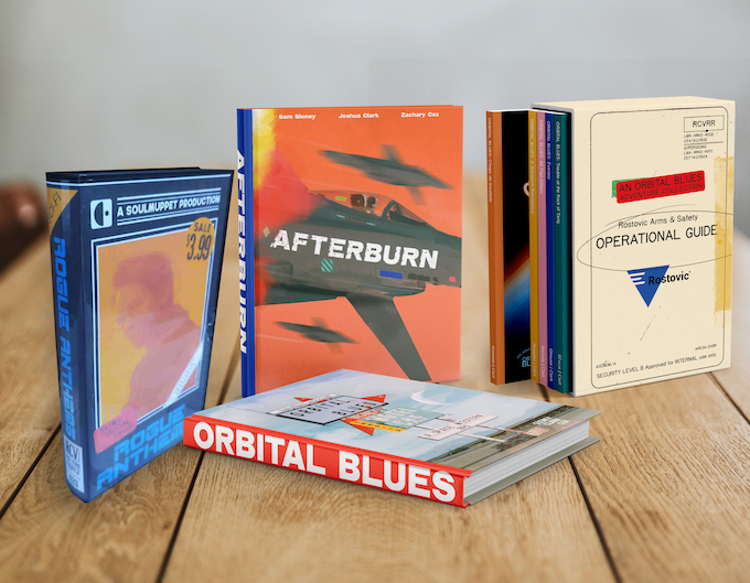 It’s a very good chance to get the core team together again because Sam and Josh and I have been kind of off doing different things. I've been project managing and Sam and I haven't really done any writing and Josh has been making literally hundreds of art pieces across all these different books. The art for Orbital Blues – you won’t believe it until you see it. It's all like photo bashed, public domain art painted over to look like in-universe advertising materials and band posters and, like, postcards from some distant planet with two moons on it. Very truly, this is a pleasure to get the team back together again and keep making more books.
