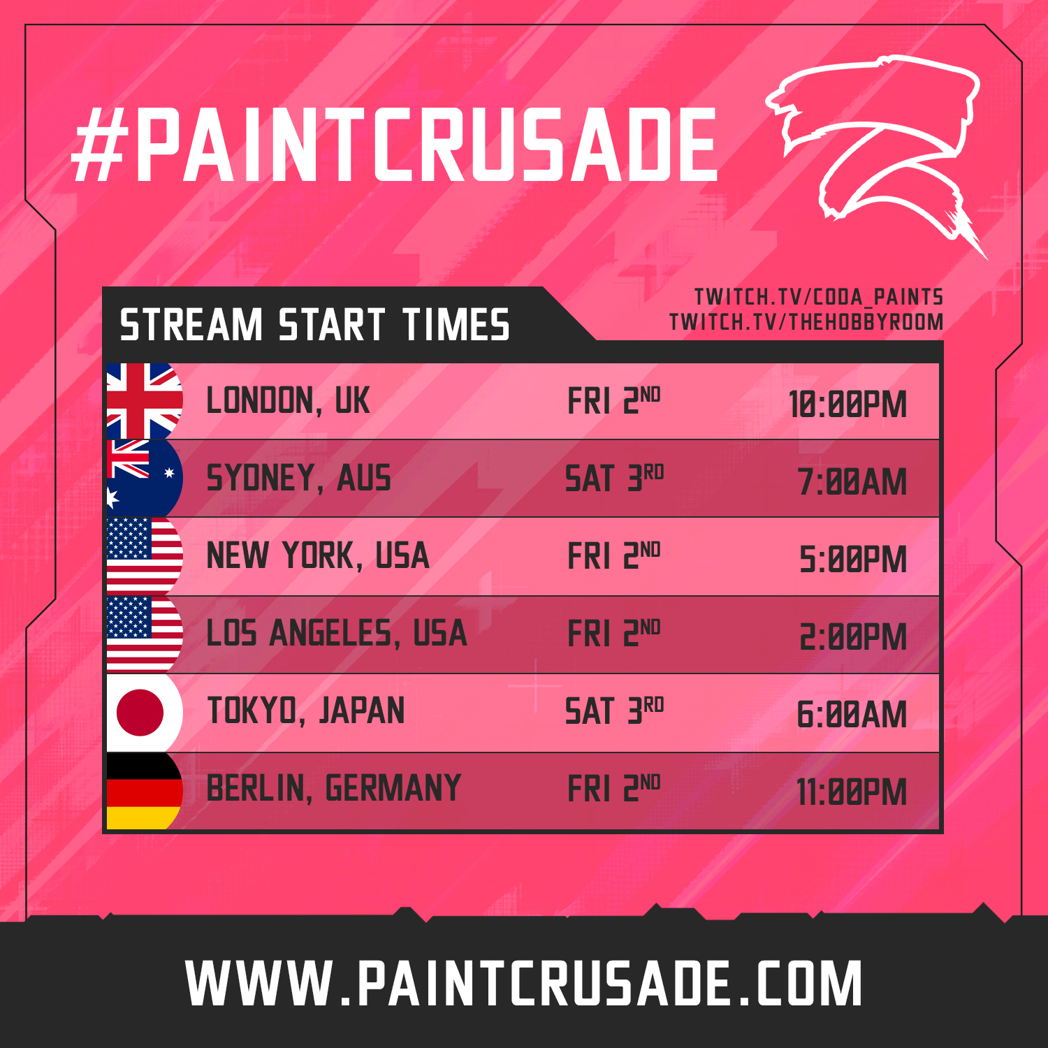 If want to know more information or want to join in on the crusade and take up the challenge, jump over to the Paint Crusade website or the Coda_Paints or The Hobby Room twitch channels, which will be streaming for 48 hours, continuously, over the weekend in 12 hour shifts.