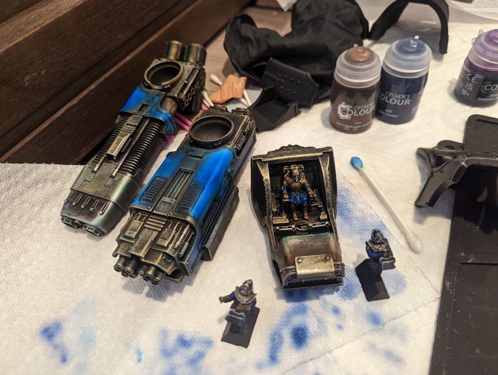Painting the blue turned out to be a bit of a problem, though. The basecoat blue we were suppose to use, Macragge Blue Air, had apparently frozen in Caleb's truck while they were setting up overnight. This meant that the paint would not flow through the airbrush because it was too thick and big. I wound up eventually using a coat of Celestium Blue for my midtone layer, broad highlights of Lotherin Blue, and then spot highlights of Ulthuan Grey. They were then "filtered" by a light spray of Talassar Blue. This created a nice, rich, and vibrant blue.