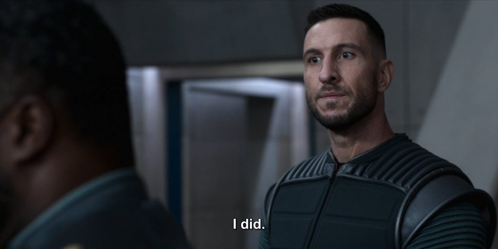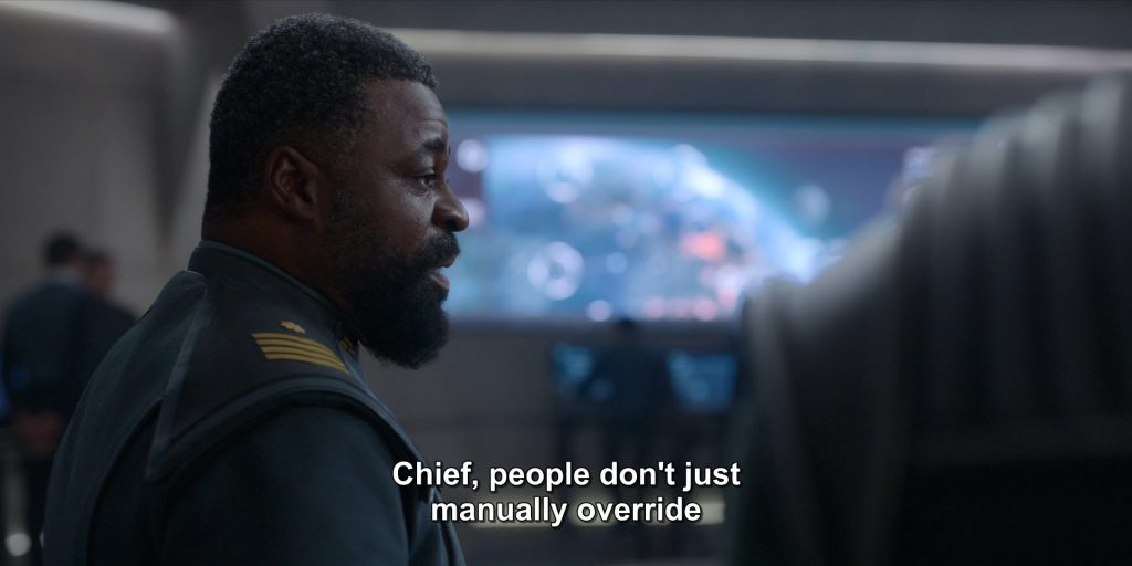 (We’re not going to extensively get into the caterwauling over John Halo having sex here because almost all of those complaints are tummyfeel nonsense signifying a refusal to engage with the show on its own terms, but it is very funny that after the ‘sex scene,’ which is so vanilla and shows so little skin you could get it on TV in Fox’s 8 PM prime time slot over broadcast, we get the actual most graphic scene of the show as Makee rips off her own fingernail to remove a secret Covenant-implanted weapon there. There’s a lot more gory body horror in Halo, from the teenagers in the Covenant attack in the first episode getting splattered by plasma fire to some very squicky eye and fingernail-based setpieces, than I would have expected).
