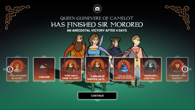 While it’s likely to draw a lot of comparisons to The Banner Saga for a number of reasons -- the apocalyptic mood of the story, the serious consequences for characters killed or left behind on the field of battle, the mining of a mythic age for a tactics game, the art style (though despite some stylistic similarities Banner Saga is in a bit of a different class here in production values) -- Pendragon is a more interior, more focused, and less epic experience, in the literary sense; it only concerns the week or so at the end of Arthur’s life, not some great journey spread across three full games. Still, it’s diverting enough, does a lot of interesting things right, and has a bunch of replay value...if chess is your thing.