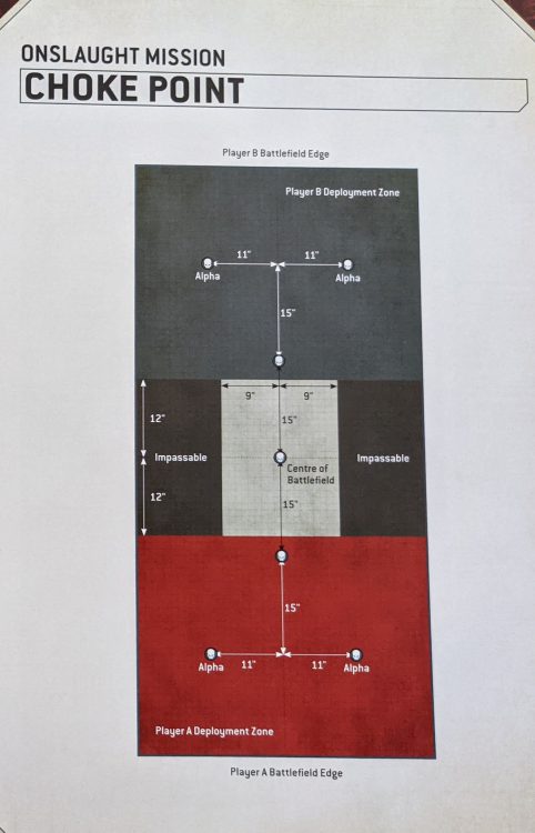 Rob: I’ll be honest - I was surprised at how much work went into making the Onslaught missions; each has custom deployment maps and there are a couple that are significantly mechanically different from any of the book’s smaller missions. Choke Point is by far my favorite of these, which introduces two massive, impassible parts of the battlefield that only flyers can pass over. I’m a sucker for missions that play with the table structure, though.