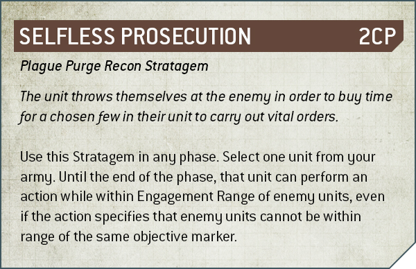 - Selfless Prosecution (2 CP) is one I’ll probably need to tattoo to the back of my hand. It allows you to perform an action while within engagement range of the enemy even if it would normally fail.
