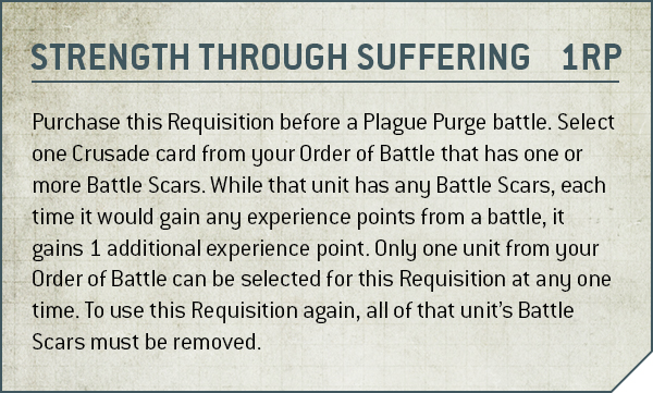 - Strength Through Suffering (1 RP) - is used before a battle to pick a unit that has any Battle Scars. While that unit has any battle scars, it gets +1 XP any time they earn any XP during the battle. You can only use this on one unit at a time and in order to use it again you have to remove all of the battle scars from the unit.