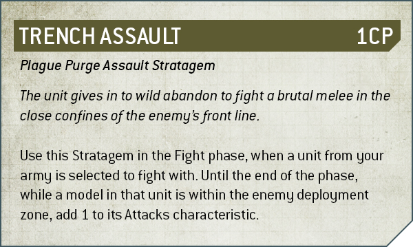 - Trench Assault (1 CP) adds +1 to the Attacks characteristic of a unit wholly within the enemy deployment zone.