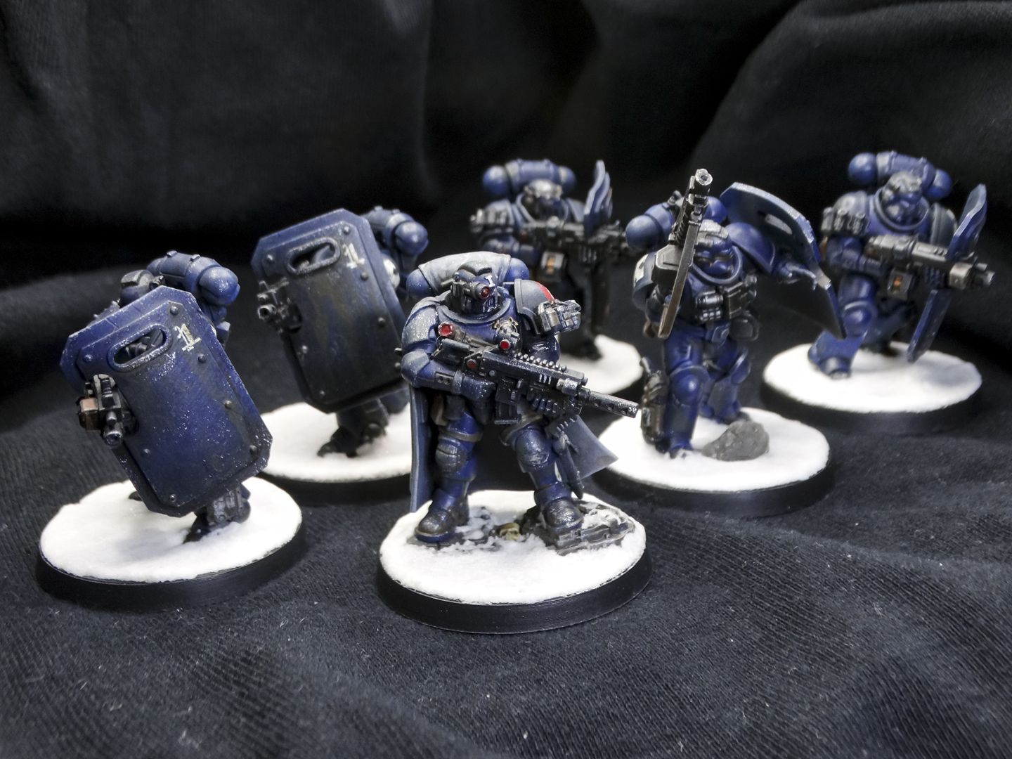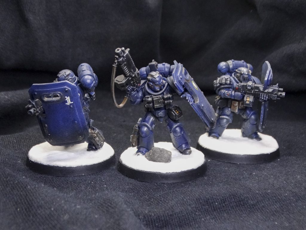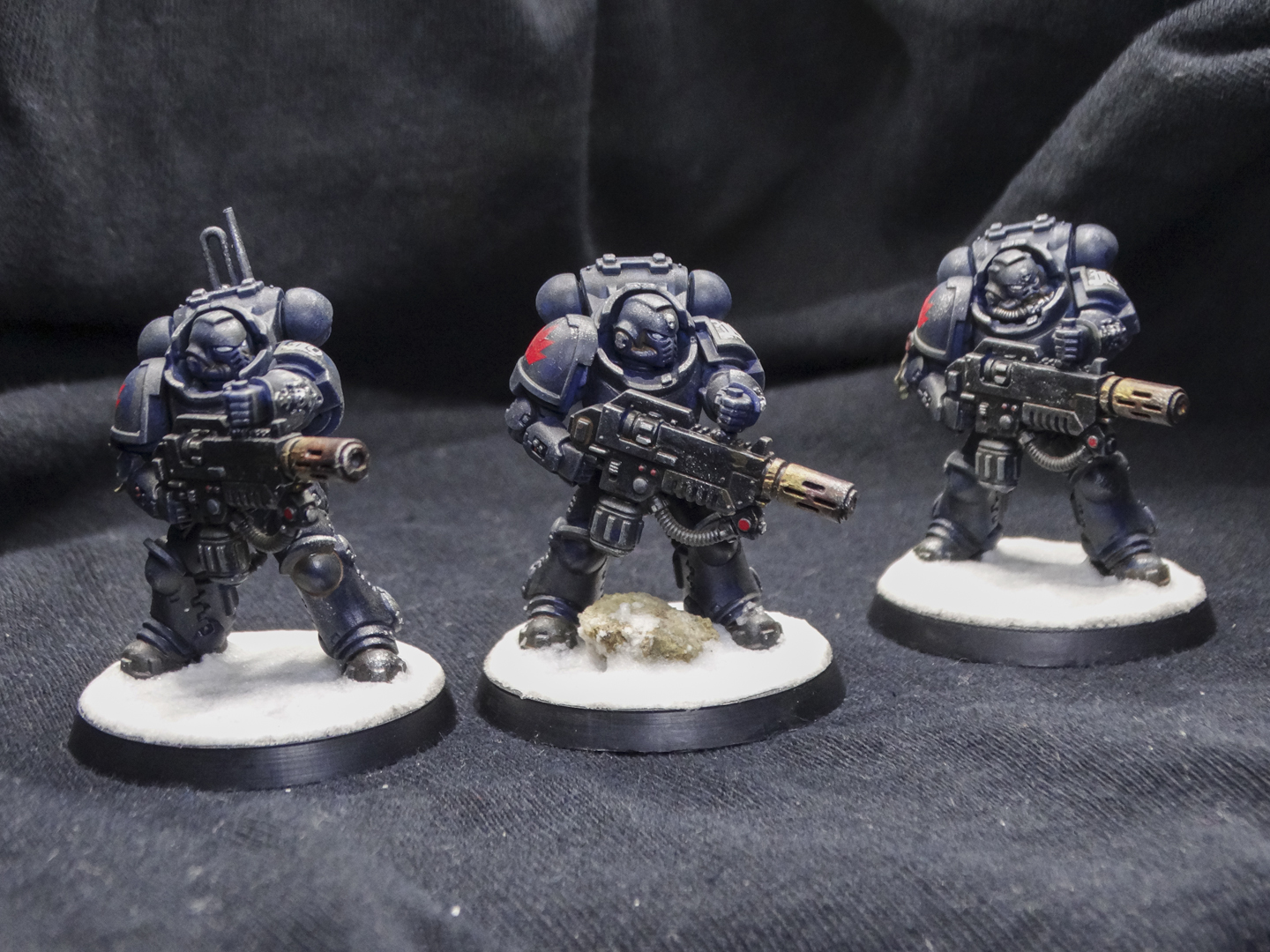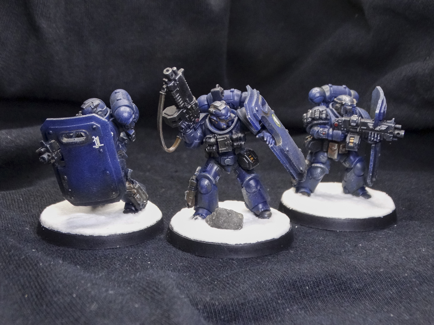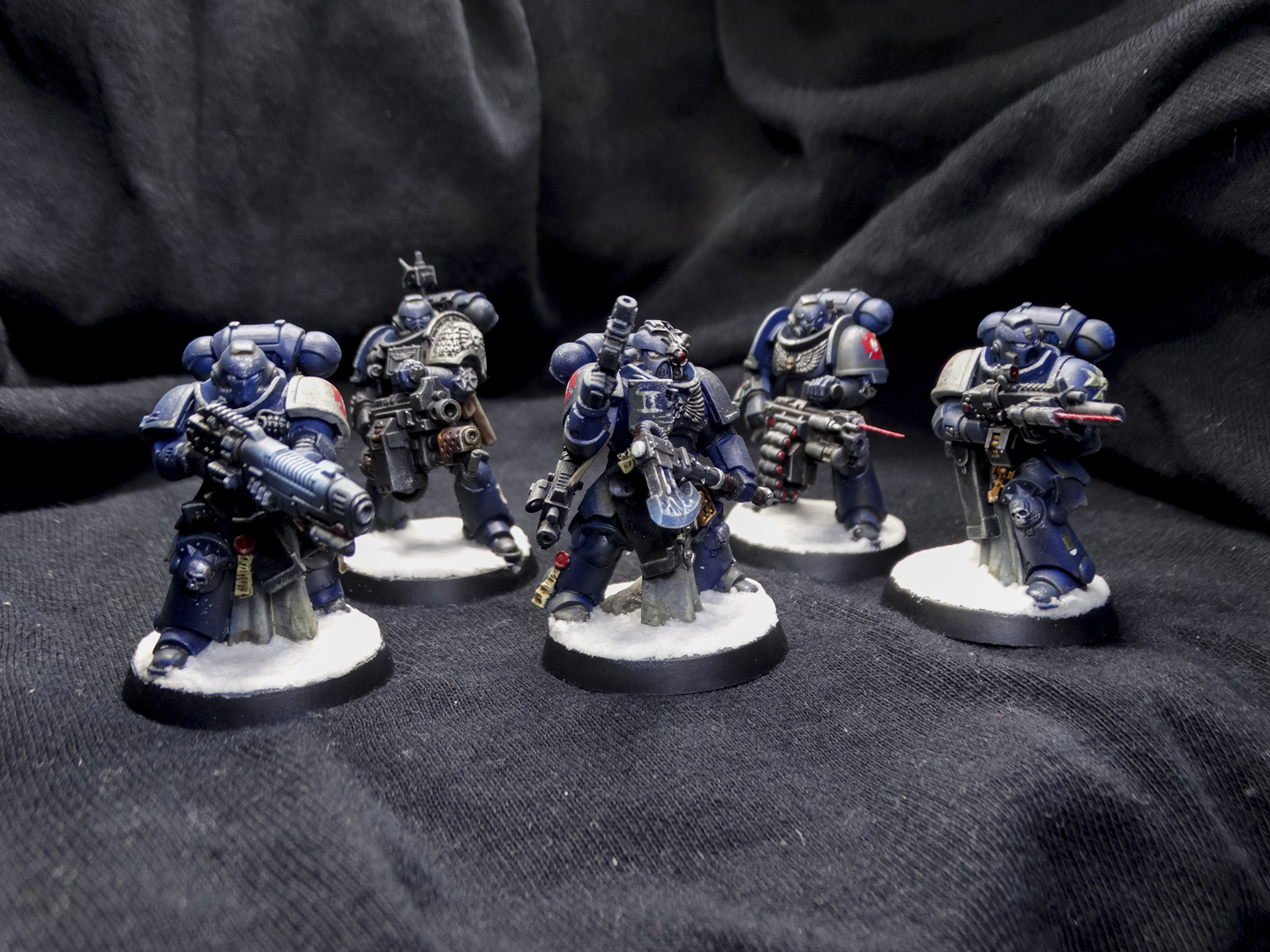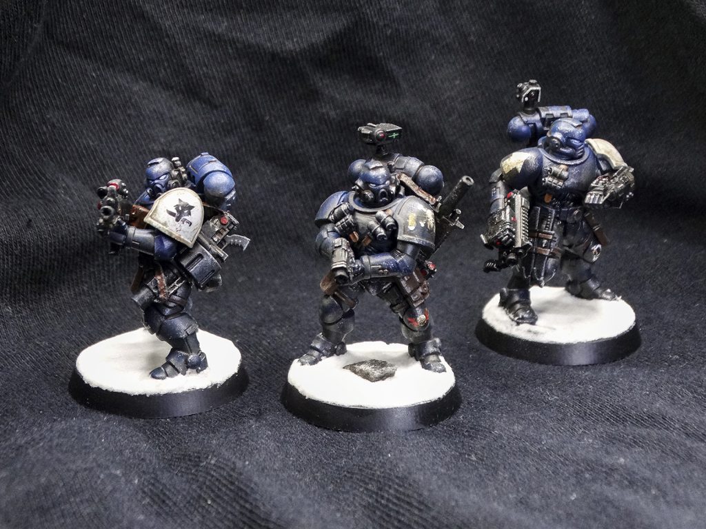 Everyone is painted in the Iron Panthers' characteristic dark blue, with white and red accents. Heraldry and squad markings are present, but vary from unit to unit. The decision to base them on arctic bases was intentional, as my entire army is arctic warfare themed. Despite being a 'boarding' patrol, I didn't have affordable access to space hulk bases and didn't want to break my army theme.