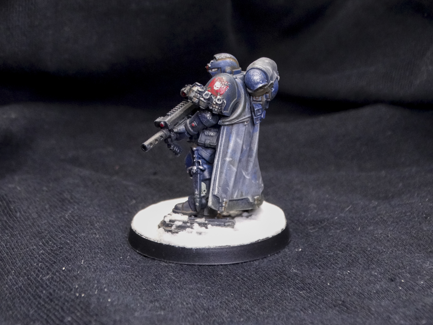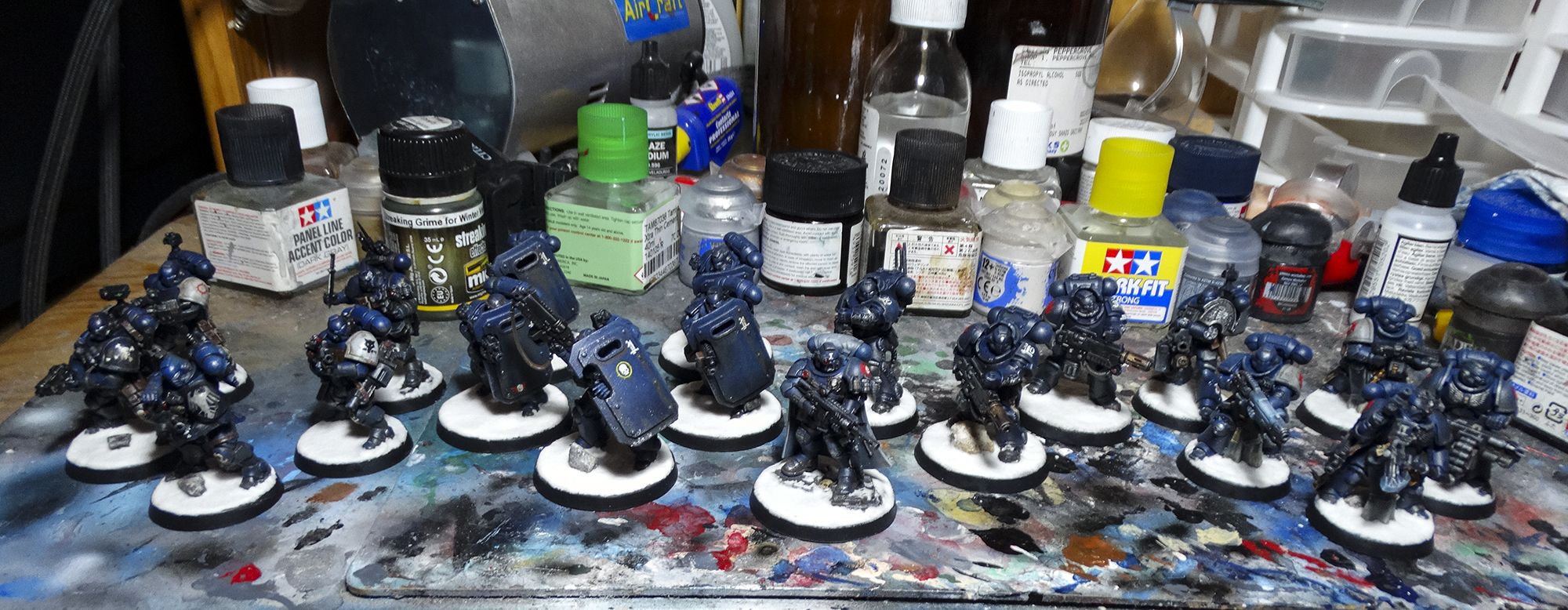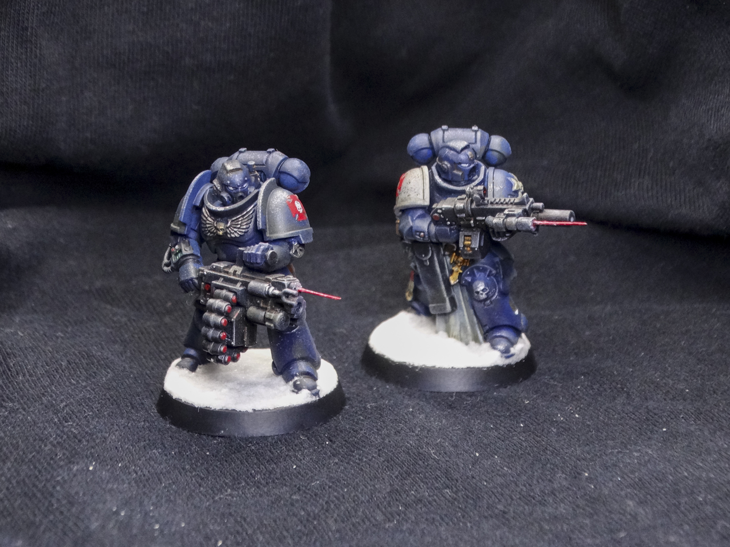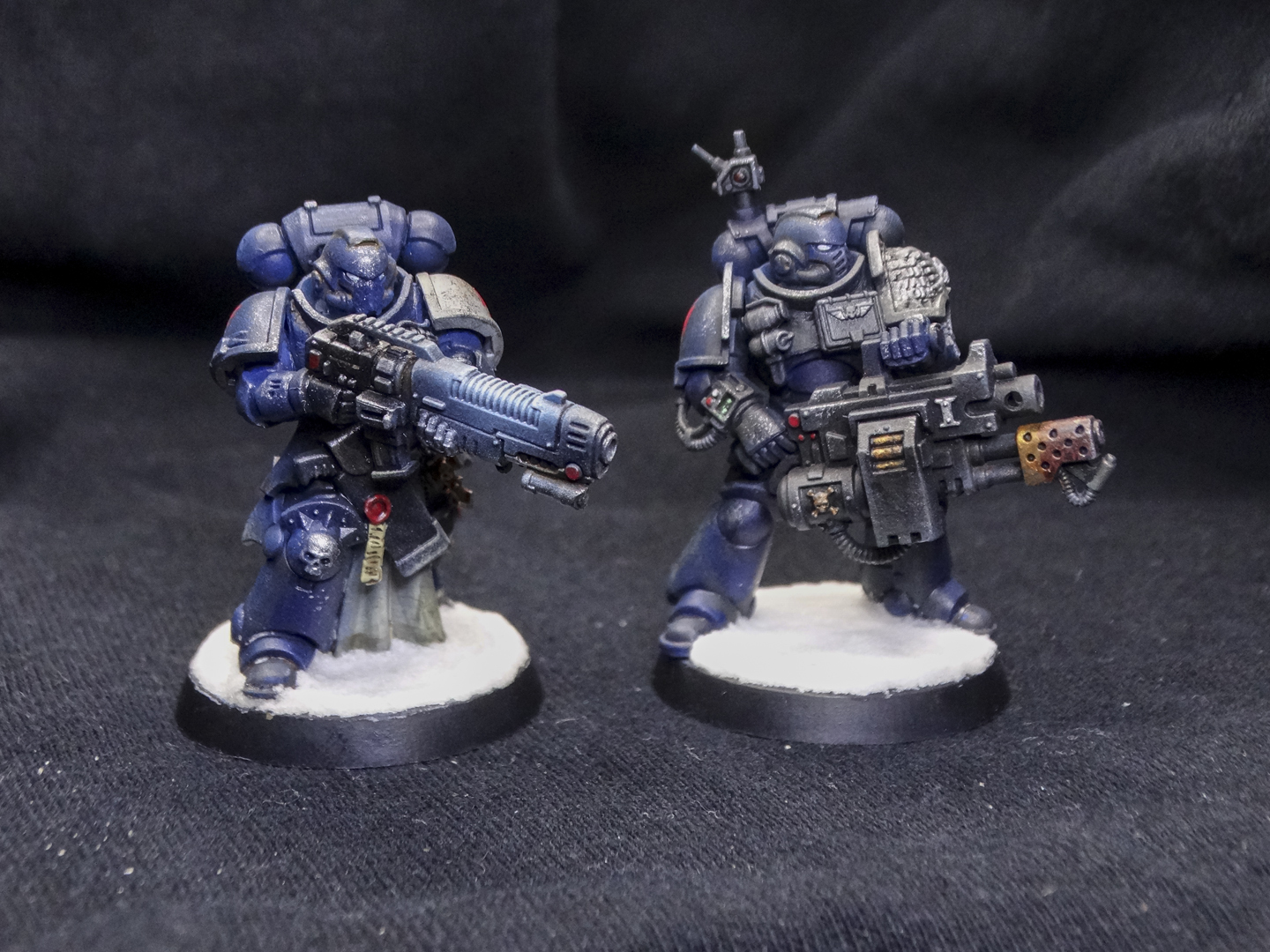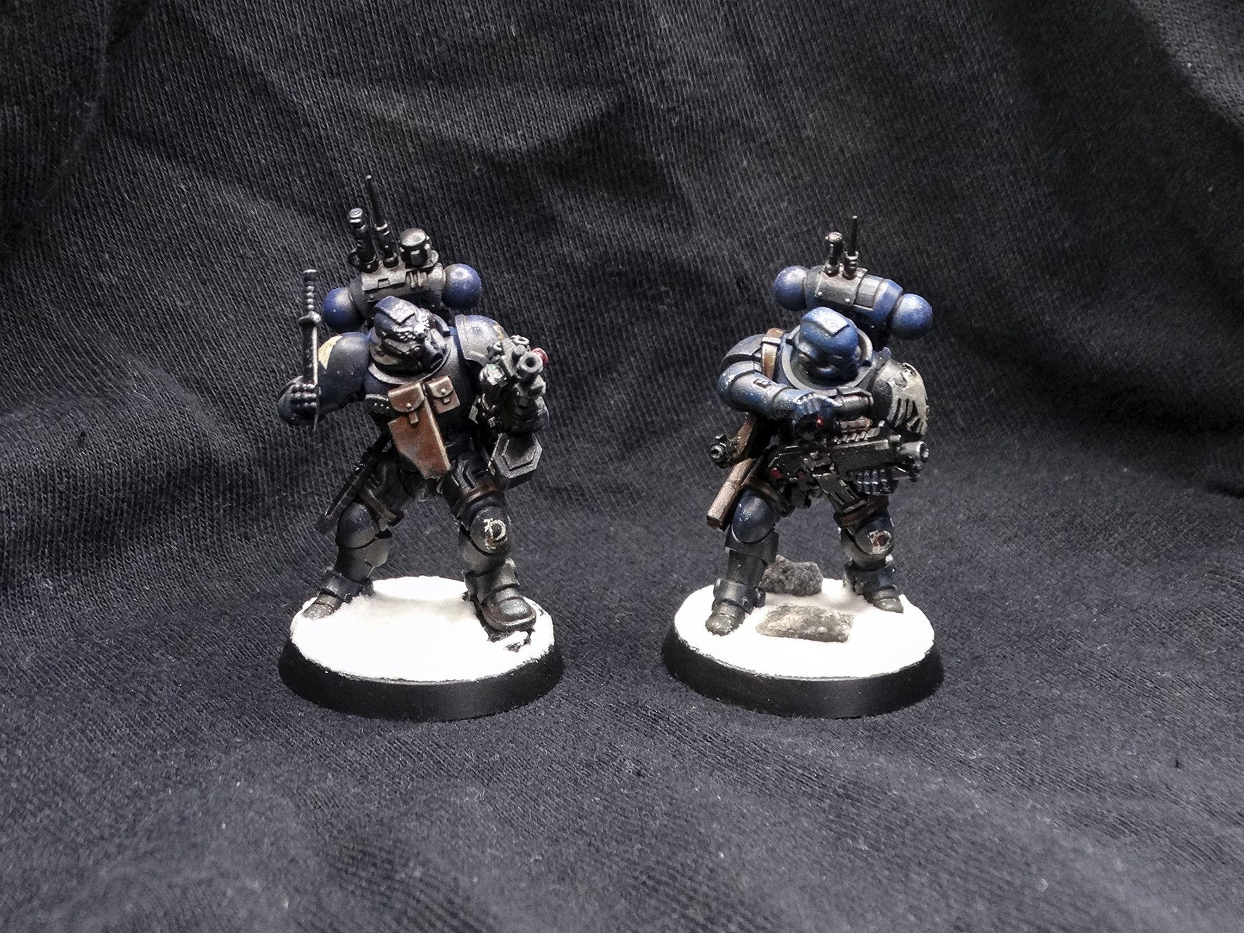 Everyone is painted in the Iron Panthers' characteristic dark blue, with white and red accents. Heraldry and squad markings are present, but vary from unit to unit. The decision to base them on arctic bases was intentional, as my entire army is arctic warfare themed. Despite being a 'boarding' patrol, I didn't have affordable access to space hulk bases and didn't want to break my army theme.