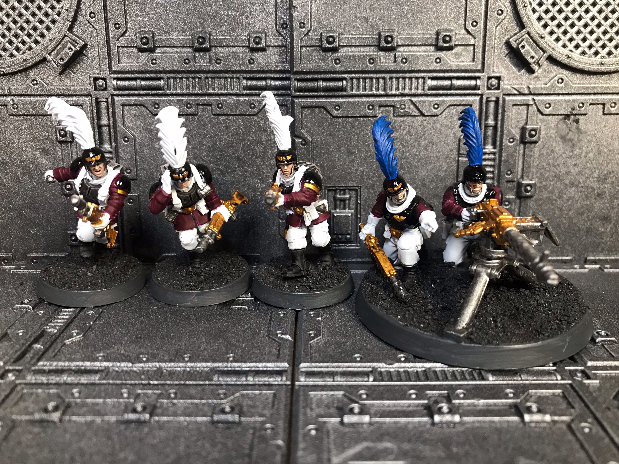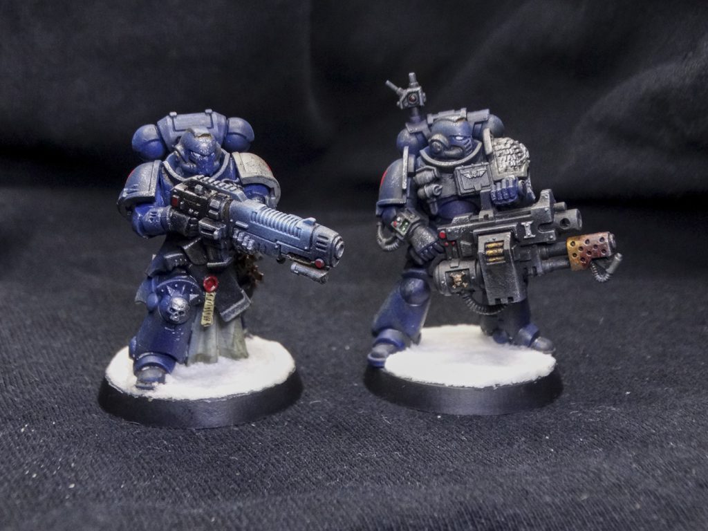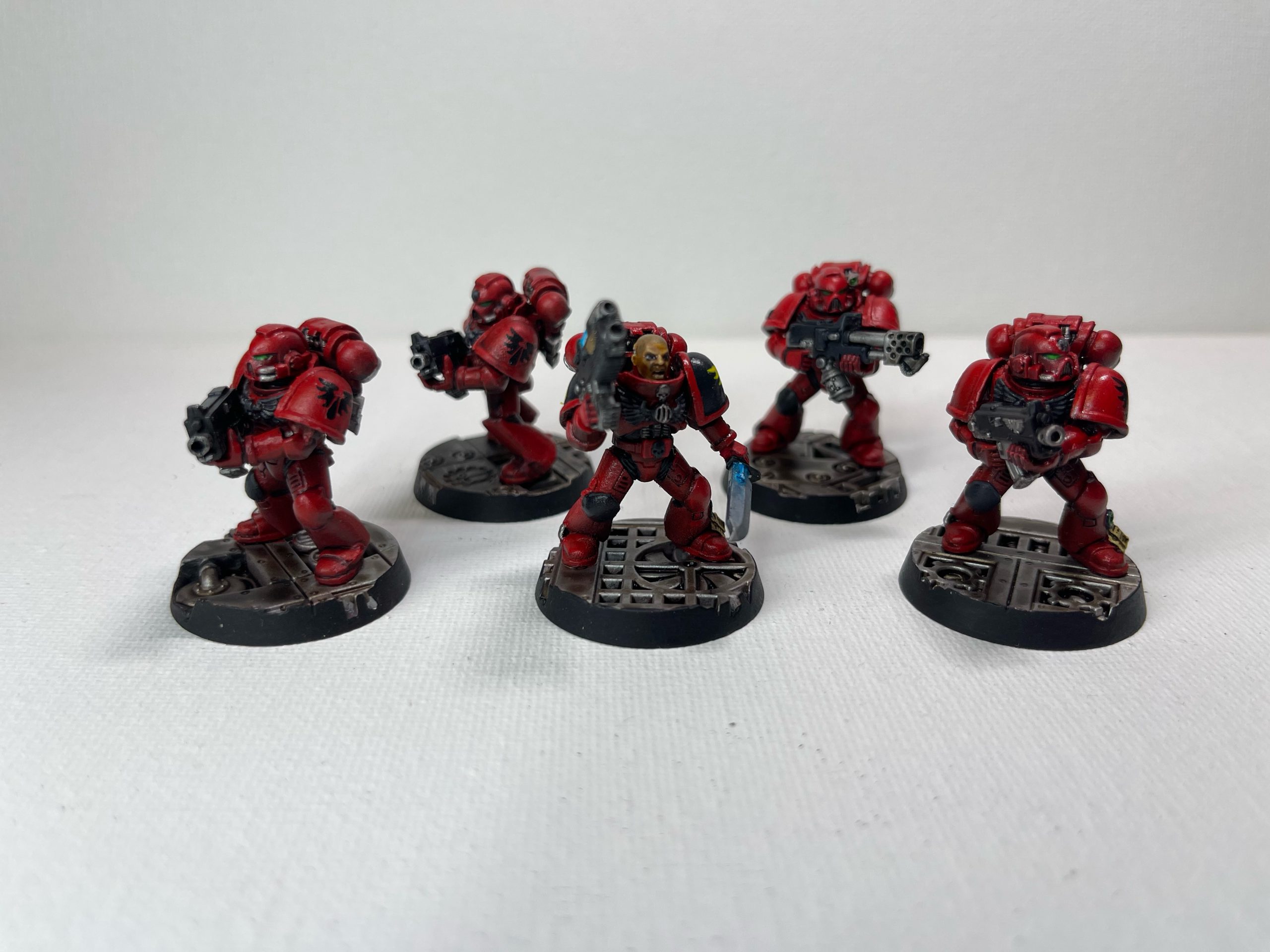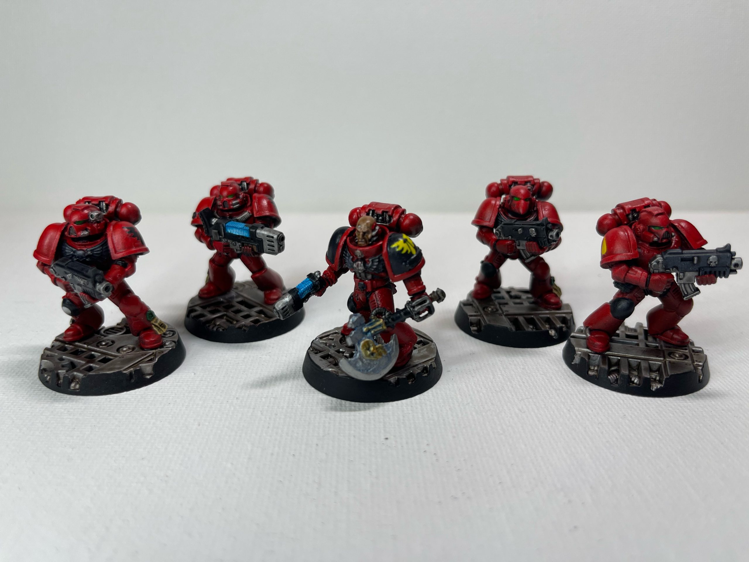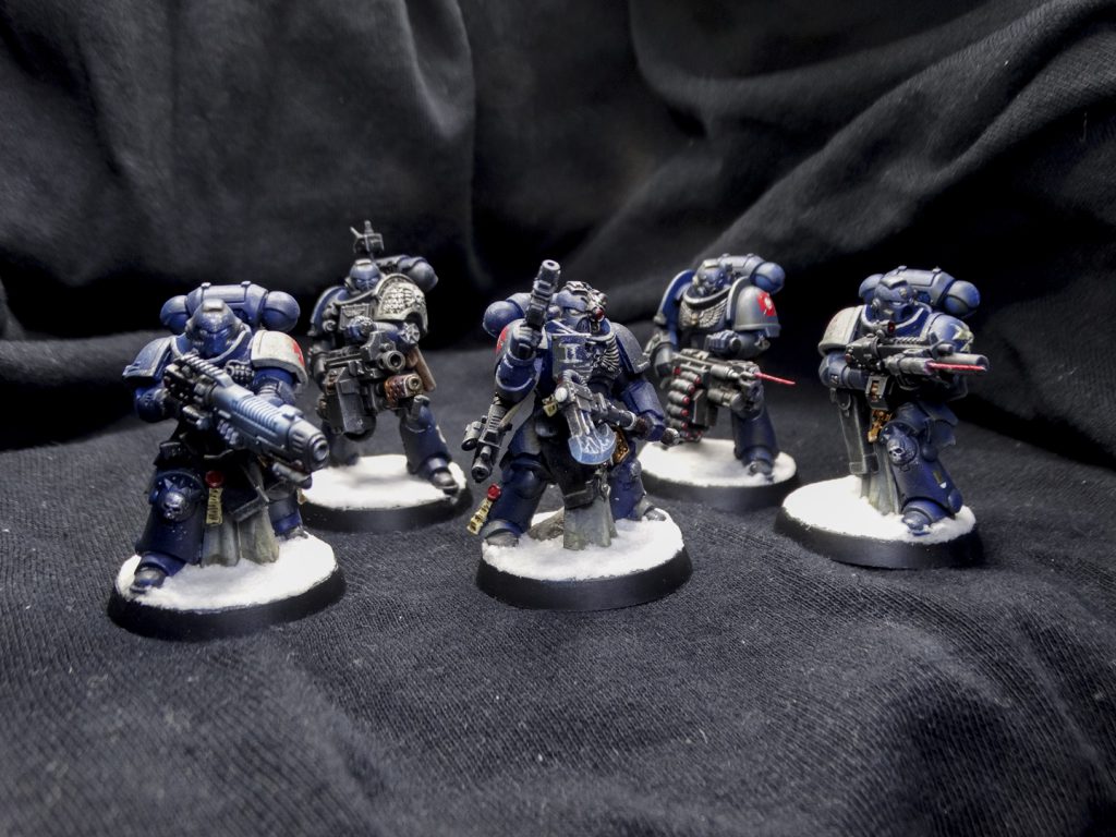 From left to right: combi-plasma trooper, Deathwatch veteran heavy gunner, sergeant with power axe and bolt pistol, heavy gunner, veteran with personalised rifle.