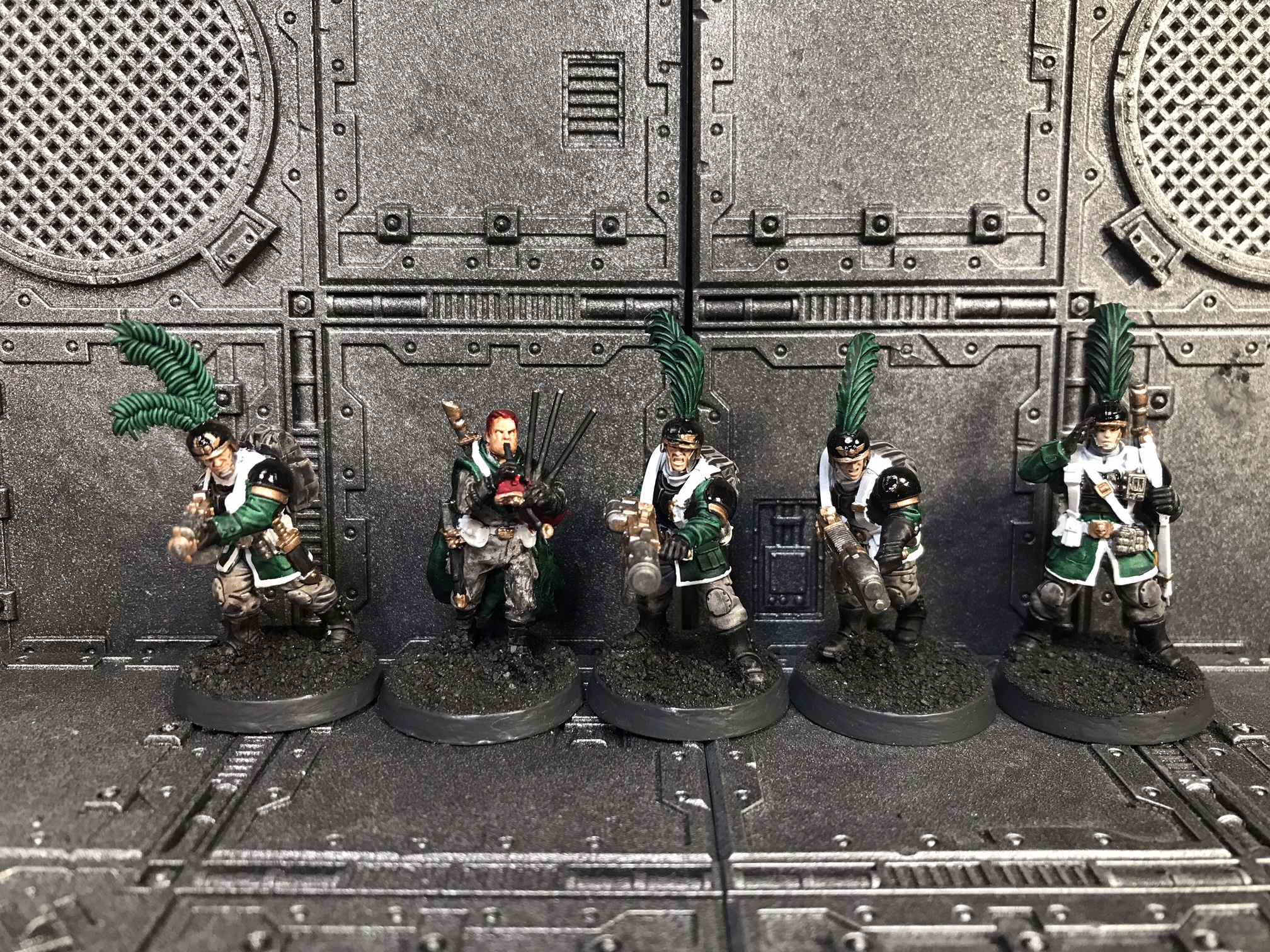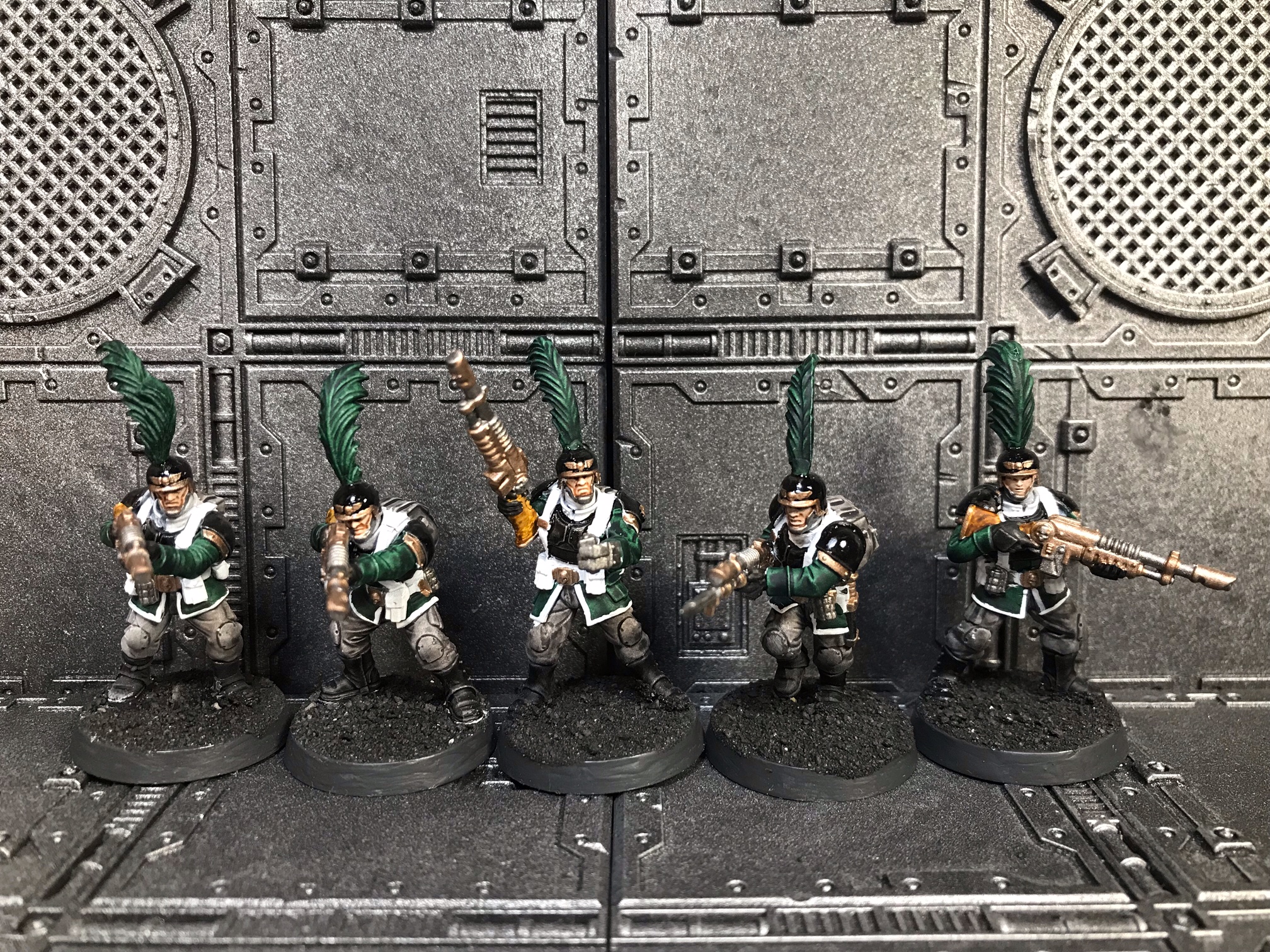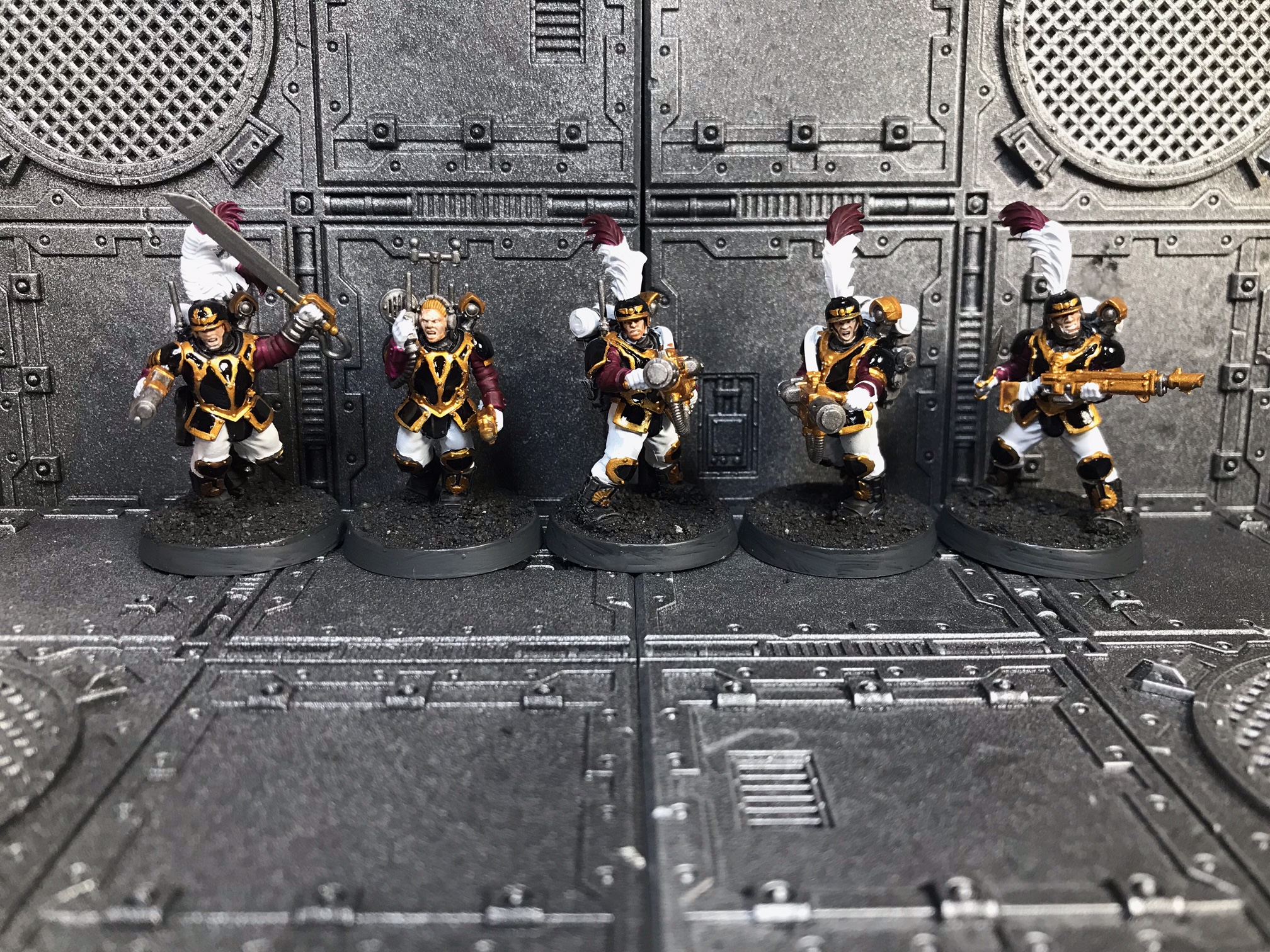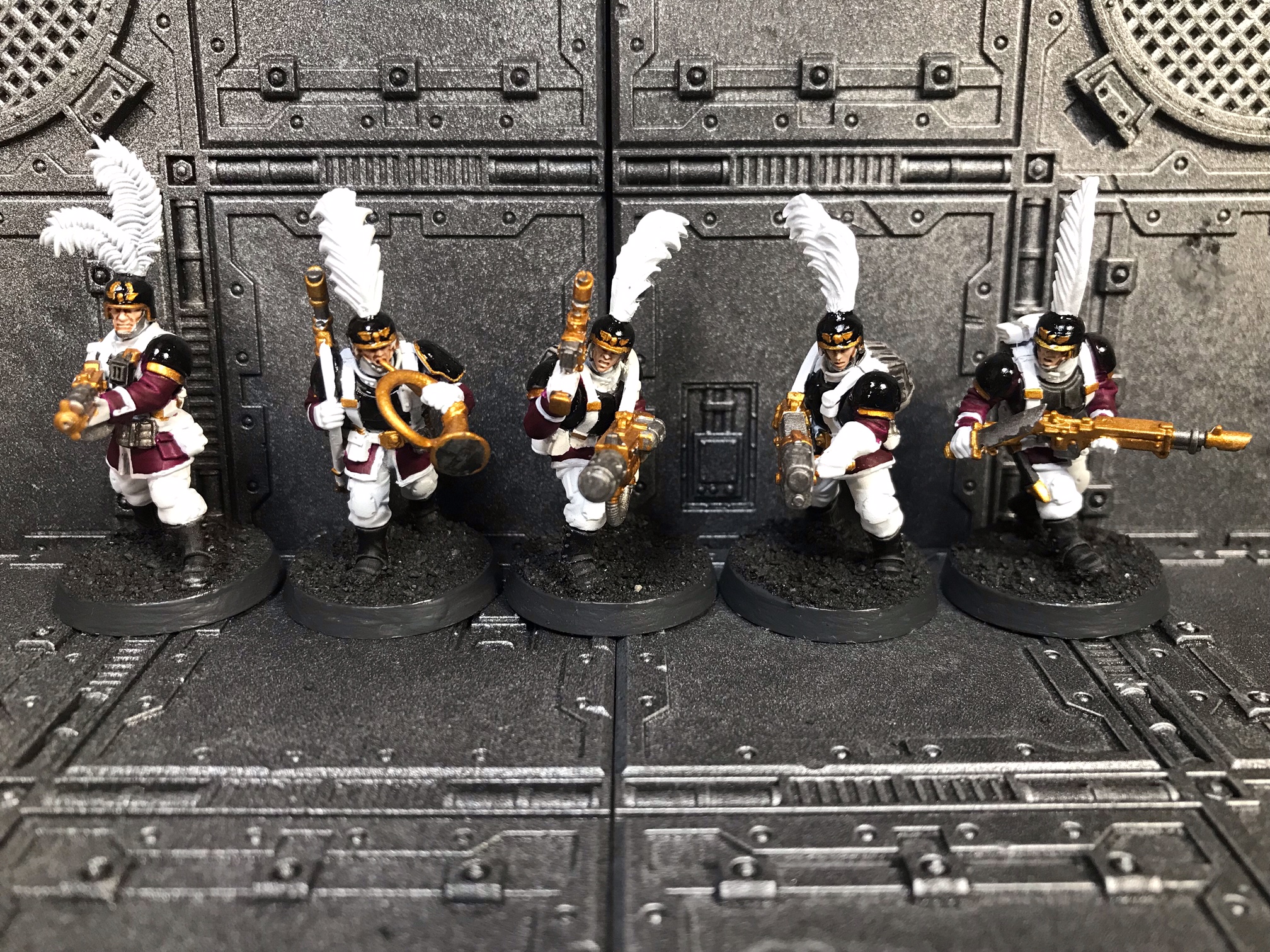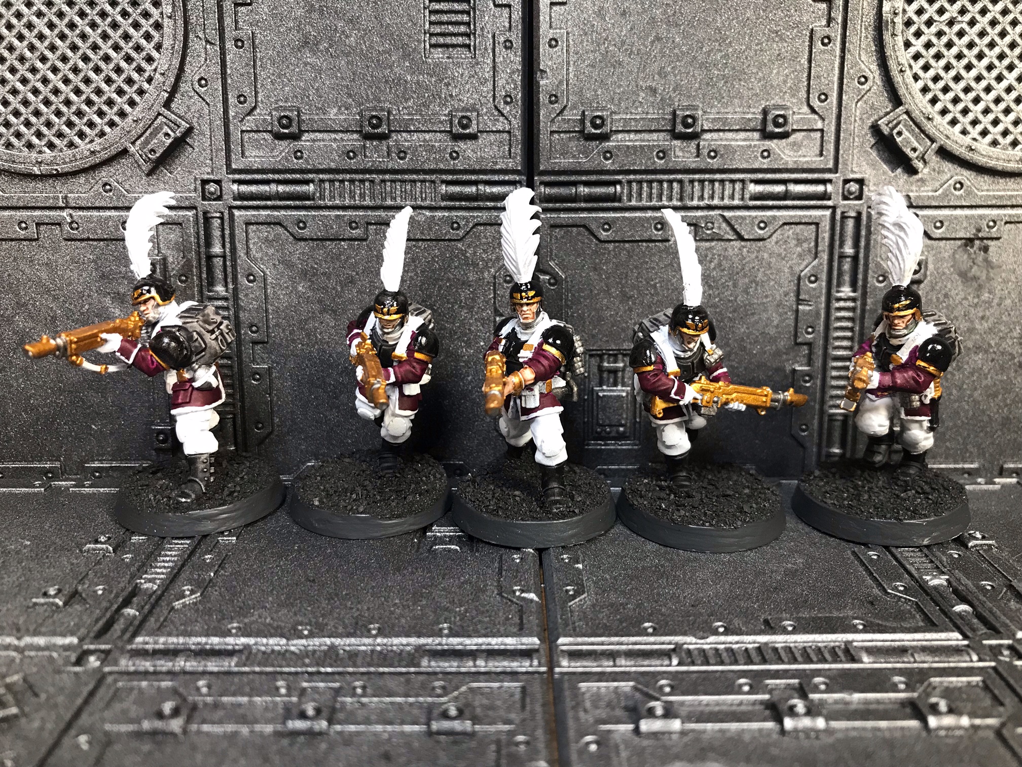 From left to right: combi-plasma trooper, Deathwatch veteran heavy gunner, sergeant with power axe and bolt pistol, heavy gunner, veteran with personalised rifle.
