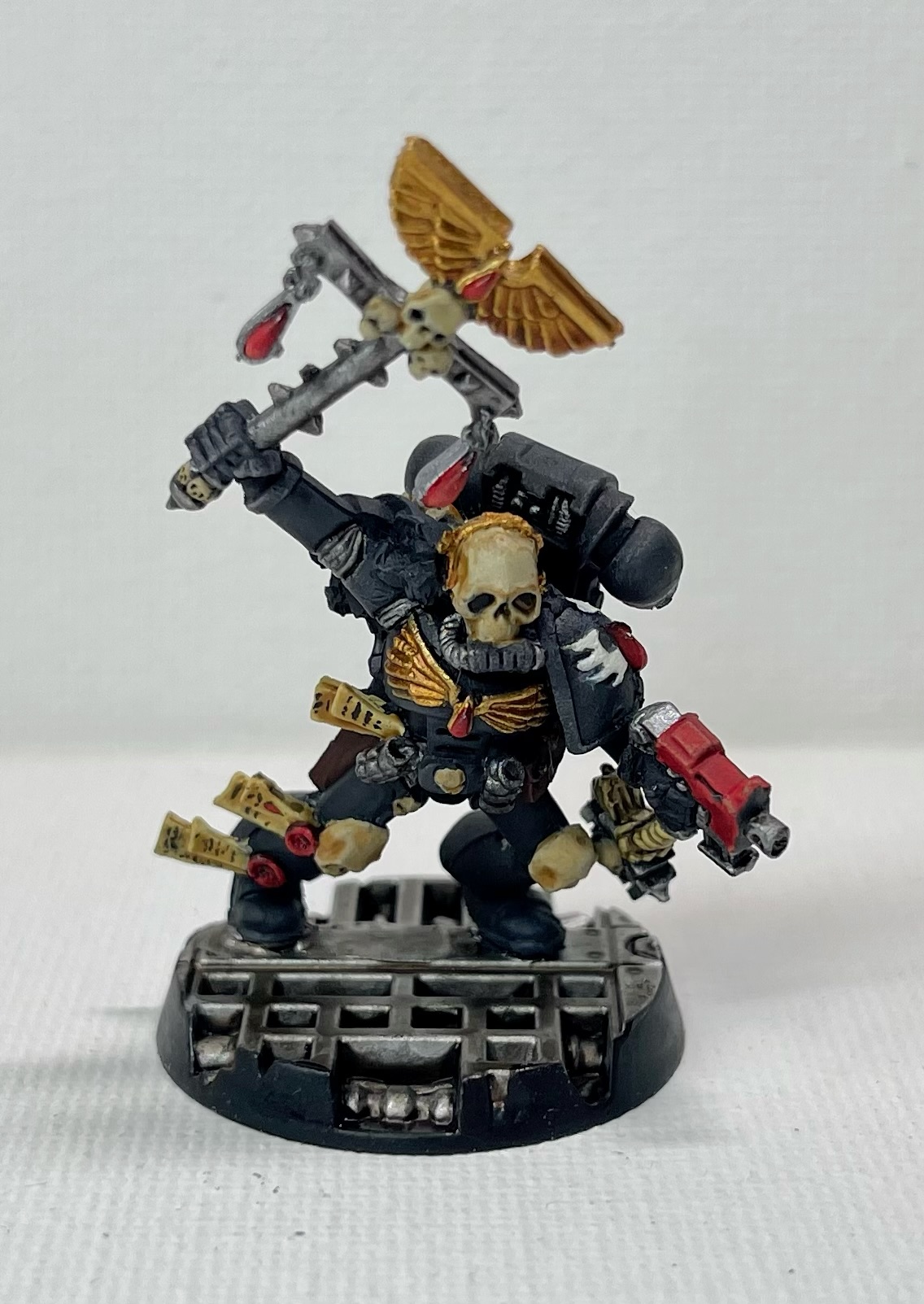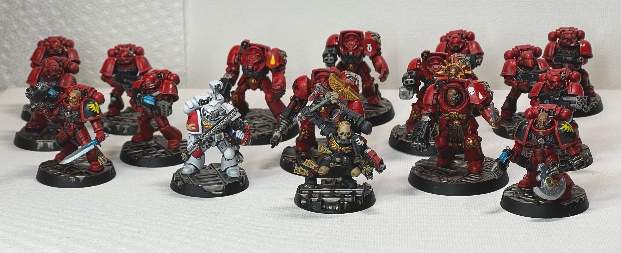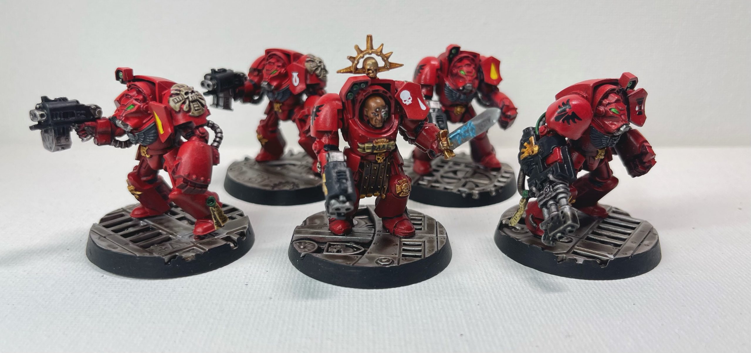 Hello, my name is Ankur, and I’ve attached my entry for the boarding patrol challenge! I’m still a beginner and was nervous about spending a lot on new models, so decided to use some old used ones from eBay. It took longer than I planned to clean and reassemble them, and had to paint over some old primer in some of these, but was overall happy with how it all turned out! This was a great way to challenge myself to try to hit a deadline and learn how to efficiently batch paint!The force consists of a chaplain, sanguinary noviate, 5 man terminator squad, and two 5 man tactical squads, which I believe should come out to exactly 500 points. While they are smaller, I sort of enjoy the look of the all-firstborn force, which makes the size difference somewhat less appreciable.