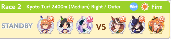 Here, you can see my team that competed at the same length, weather, and turf condition; while the track isn't the same, this gave me a good idea of where my trainees stand currently.Once you’ve settled on a racer for this distance, keep in mind that you’ll need two more of them to complete your team, so you’ll likely want to set your sights on three or four Umas that you have available to train, and begin working on them. If you’re limited in terms of your roster because you either haven’t pulled many extra racers, or just don’t feel like it, you can still make a competitive team off the five racers you’re given when you start the game, namely focusing on Gold Ship, Vodka, and Daiwa Scarlet.