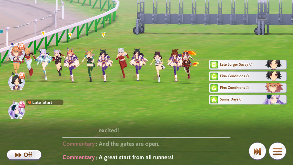 Before a race, you can check your team and opponents full stats, and see where you stack up.Selecting a Front Runner is important because Front Runners set the pace of the entire race. Having a competitive Front Runner who can stay in front of the other races not only bends the race to their own whims, but also prevents other Front Runners from running in the way they prefer, causing them to lose Stamina. By having a Pace Chaser in your second slot, they can build off of following your Front Runner. This also means that if for any reason your Front Runner gets surpassed later in the race or begins to run out of steam, the Pace Chaser will be best suited to immediately pick up the slack on the final spurt to clinch out the race.