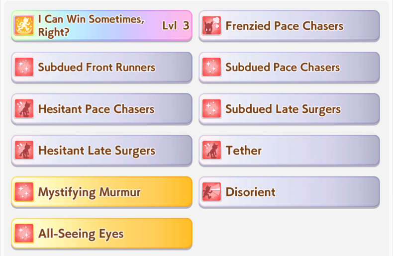 For healing skills, we find ourselves once again at the mercy of Super Creek: You absolutely want your racer to have Swinging Maestro (unless your racer IS Super Creek, obviously). In many cases, you are probably fine without worrying about other healing skills if you feel you won’t have the skill points for them, but some other good choices are Hydrate/Gourmand for Pace Chasers, Moxie for Front Runners (to deal with uphill fatigue), or Relax (Late Surger). A few Umas have very good built in heal abilities, such as Sleeping Lion (Narita Taishin) and Trackblazer (Mihono Bourbon), and Unique skill choices from 3 star Agnes Tachyon’s U=ma2 and Super Creek’s Pure Heart.