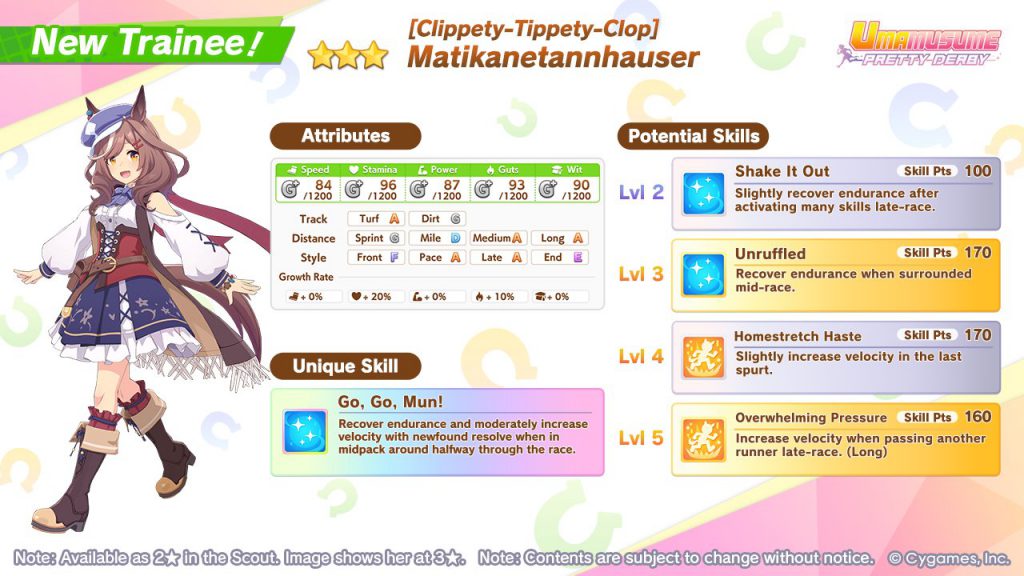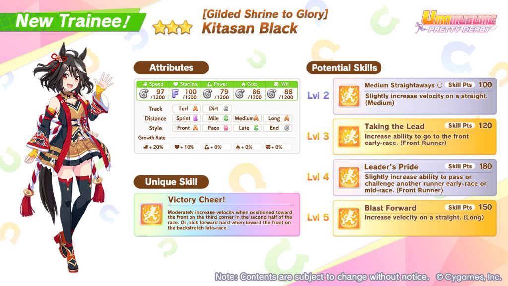 Of special note here is the recently released Kitasan Black, who if you weren’t already tired of having in your Support Deck, is now also going to be extremely valuable as a parent (or trainee) for a Front Runner. Her Unique, Victory Cheer, is exceptionally good for Front Runners and generally replaces Angling and Scheming (at least for this race, that skill is still very good), but the variability of Kitasan Black’s skill is important. To check the language on it, the skill states: “Moderately increase velocity when positioned toward the front on the third corner in the second half of the race. Or, kick forward hard when toward the front on the backstretch late-race.” For longer races, the second half of this skill is going to be crucial, and is often a tool that will get a competitive Front Runner the edge they need to get over the other racers at the end of a Long race. So if you don’t have Kitasan Black to train yourself, you should keep an eye out for a Kitasan Parent that you can borrow to provide your trainee with Victory Cheer.