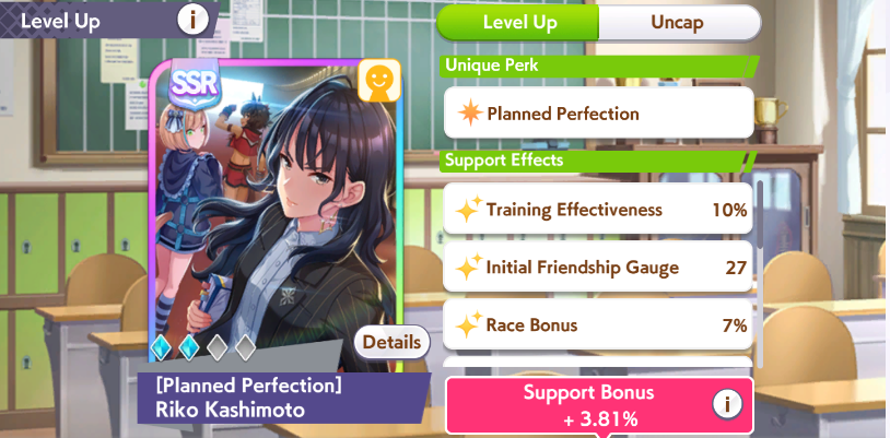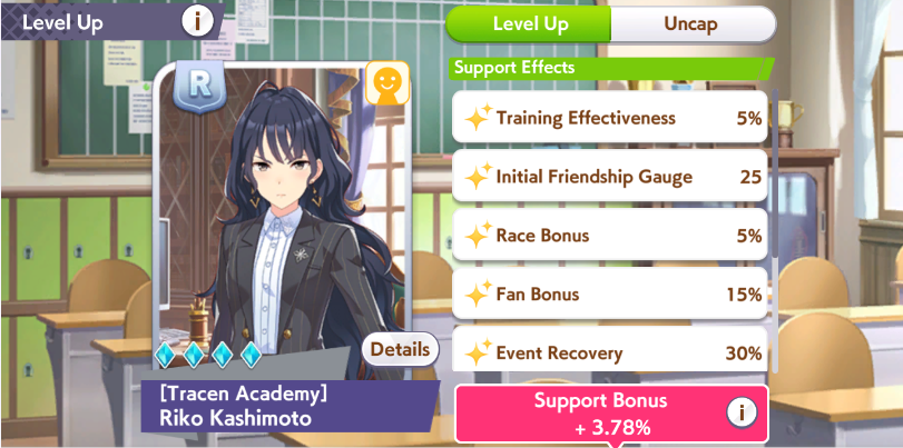 Normally, "R" cards are less valuable, but that 5% training effectiveness is actually better than LB0 SSR Riko, and far easier to obtain.First, though, let’s talk about Riko. Riko is important because when she’s used in Unity Cup runs, she provides extremely high benefits that essentially make her a free Stamina and Guts card in terms of the amount of stats she provides, but also her card provides 5% (at MLB R) or higher (for LB1+ SSR) Training Effectiveness, meaning that any time Riko shows up during training, she gives you a flat 5% buff to whatever parameter you are growing.