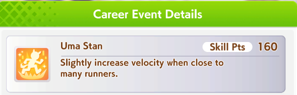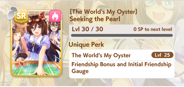 If you can get access to it, an LB1+ Riko will be better, but again, MLB R will be sufficient and very effective.I wanted to give a shout out to a card that gets overlooked, however: Seeking the Pearl SR Guts, “The World is My Oyster”. The reason for this is that the card has an event that can occur that gives access to the skill Uma Stan, a skill that up until this point has been almost exclusively locked to Gold Ship (both the trainee and the three Support Cards). Uma Stan’s effect reads “Slightly increase velocity when close to many runners”, making it exceptionally valuable in situations in which your trainee is likely to be near large packs of racers, particularly for Late Surgers or End Closers.