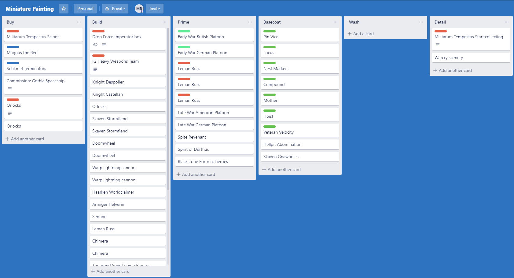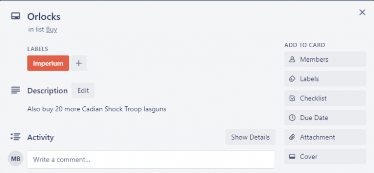 Using a Kanban tool like Trello gives you other opportunities too. While a project is in progress, you can plan additional purchases or keep notes within the cards. I’m in the process of building out a battalion of Imperial Guard using Orlocks right now, and need to keep a rough track of how just how many more Cadian Shock Troop lasguns I need. You can see in the Orlock card image I’ve also labelled it, so every major force has it’s own colour within the backlog.