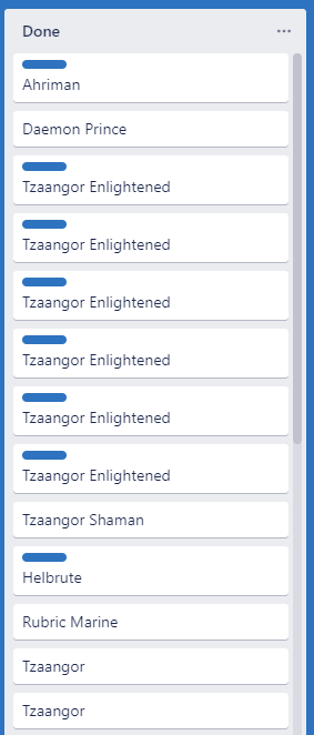 When I first started out with Kanban for miniature painting I made the mistake of making my stories far too small. While I was familiar with using them at work, I wasn’t entirely sure how to approach it at home. It turns out tracking every individual Tzaangor when you’re batch painting them 10 at a time is a path to madness, which is exactly what Tzeentch would want (I actually think he’d prefer 9).Now I typically break down a piece of work in to five models or a single box, whichever is smaller. This gives you a manageable story which you can progress from column to column, feeding a sense of accomplishment.