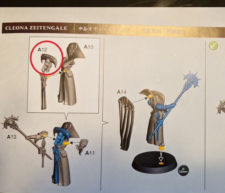 The Cleric Cleona bit “A12” (face, hat, throwing knives and a bit of robe) is listed as the first part to add to her torso, but you will want to add her arms first. If you follow the instructions you will be unable to attach the arms without damaging her hat.