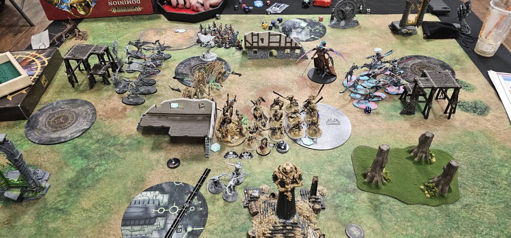 I moved up, used Supreme lord of the Bonereaper Legions to buff saves and then castled up in the middle. Joe got a little nervous with my huge castle and held back a bit and honestly that probably what got him in the end. I was able to slowly carve up each Stonehorn one by one. While he did bring some of the Big Pig RoR to try and catch me on the left flank and steal my objective, I was able to send my Stalkers to deal with them and keep the Immortis Guard, Katakros and the Archai on the Stonehorns in the middle.