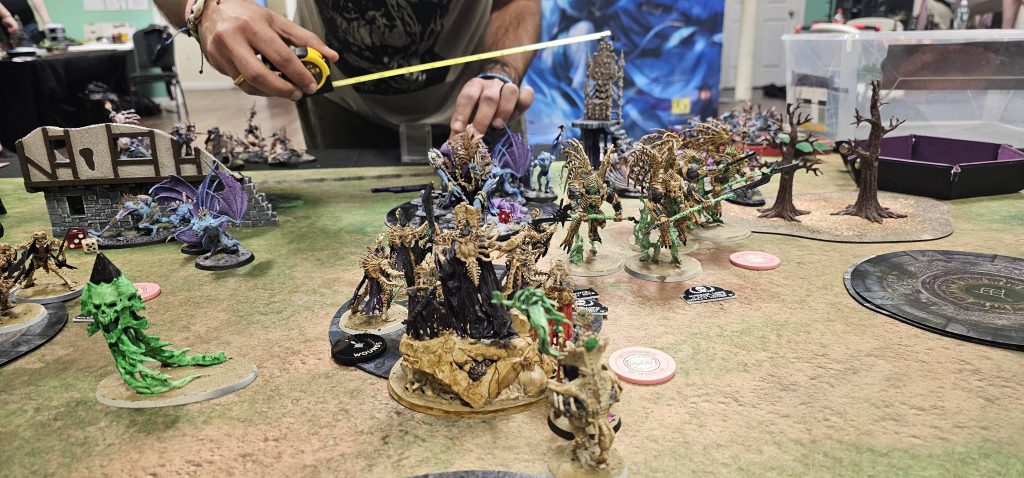 We cap it off with Linked Ley-Lines and a Mortarch-off. I was tied with Justin on regiments so we had a roll off and I won so I had him go first. He played it a bit cagey, moving some Cryptguard up largely staying back. I wanted to get up into the middle as usual and get set up, so I scooted everyone up and decided to try some long distance charges on a lark. I absolutely killed it. Three charge rolls of 8 or better. I shrugged and decided cowbabunga it is. So I charged up and mulched some Morbheg knights and the Cryptguard, definitely rolling above average.