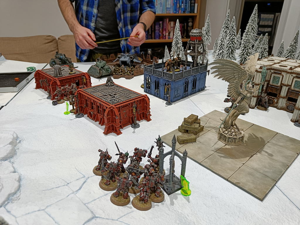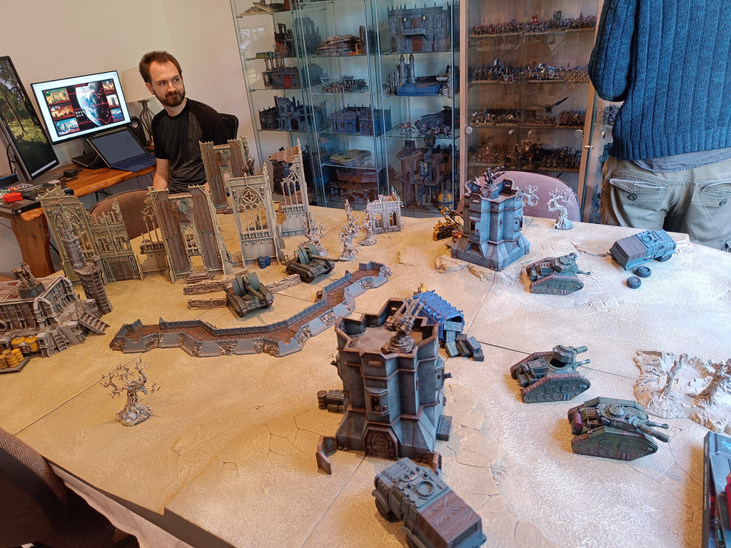 Terrain layout for the Battle of Samavor: ruined gatehouse on the left, with wrecked guard tanks and abandoned defences around it. Also pictured: my arse, and Tom's face. Credit: Charlie BrassleyFor agendas, I made the narrative decision to take Scry Enemy Battle Plans. The Imperium had no idea why the Word Bearers were here or what their plan was, so it made sense they’d try and pull the information right out of someone’s brain. It made no mechanical difference to the campaign, but it felt like what would happen in the story, and thus I needed no rules incentive.
