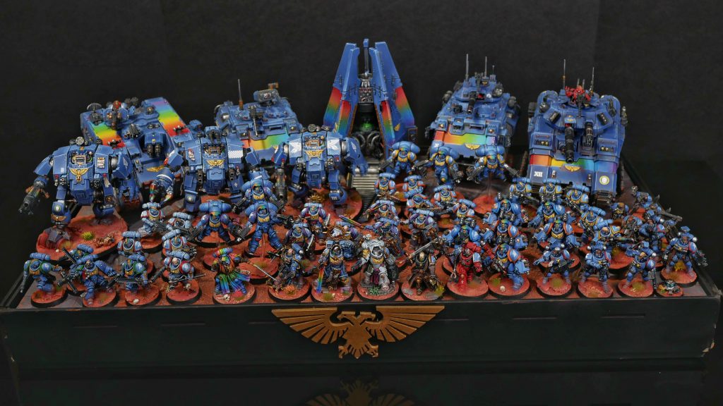 Masking the top for the rainbow striping was one of the most difficult taping jobs I've done yet, but I love the final result. This machine is an absolute beast and I can't wait for it to roll over the battlefields of the Palat system. I did want to get a unit of Terminators finished in time, but I just couldn't make that stretch goal. It wasn't really necessary, though, as the first order of battle I wrote was around 4,500 points alreadly. Whoops. I was able to pare it down to this: