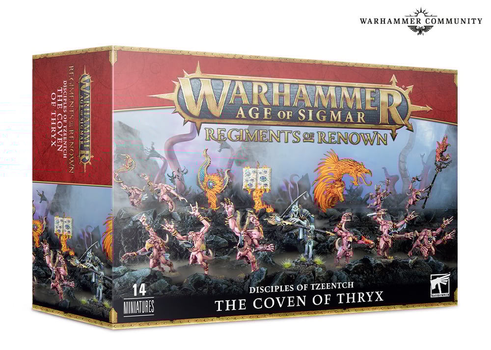 - Tied to Grand Alliances: Each Regiments of Renown unit consists of units of a handful of specific units from one of the Battletomes available and can be used by any army in that Grand Alliance except the tome they came from. For example, the Coven of Thyrx consists of units from Disciples of Tzeentch and can be used by any Chaos army except Disciples of Tzeentch.