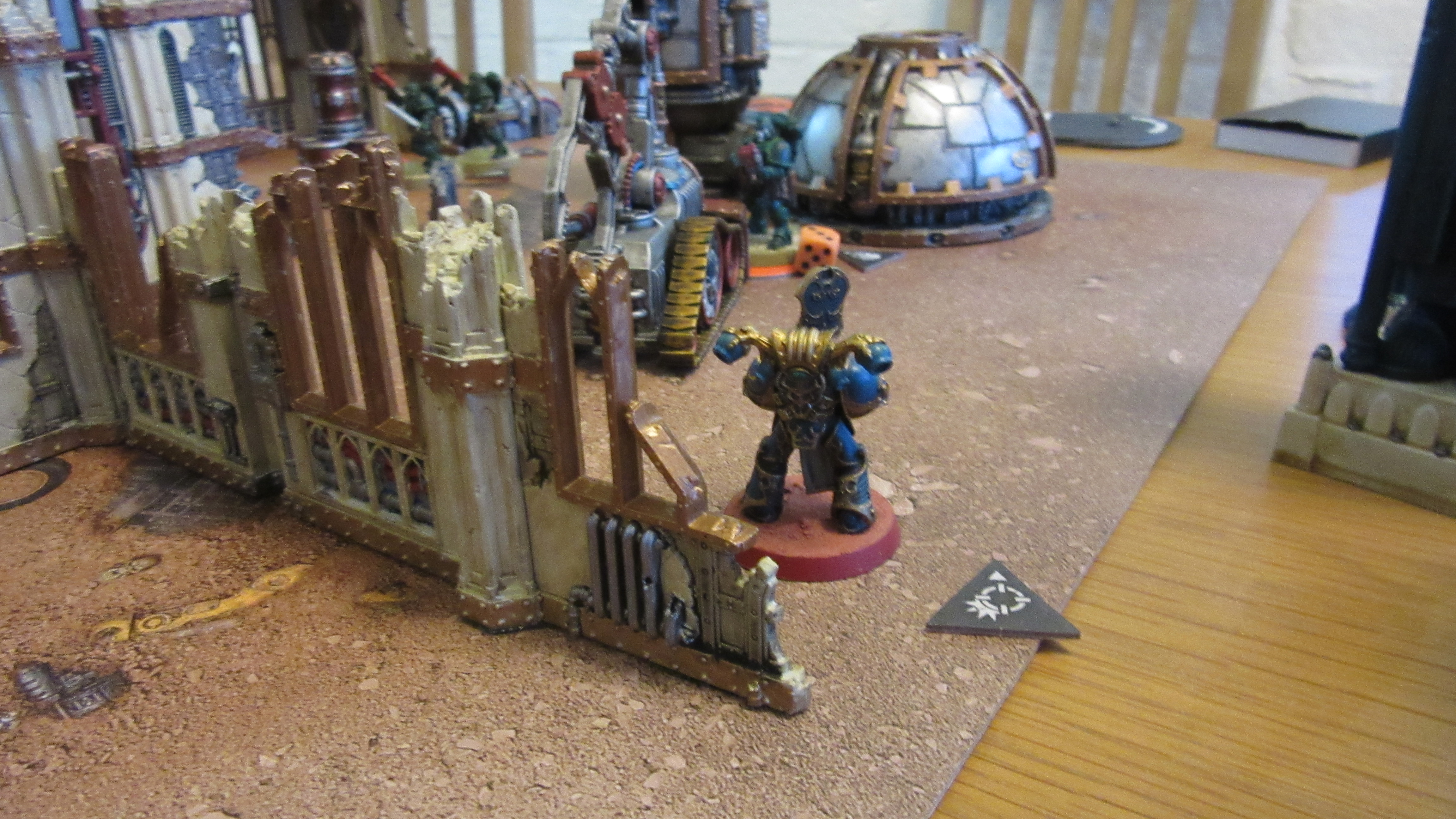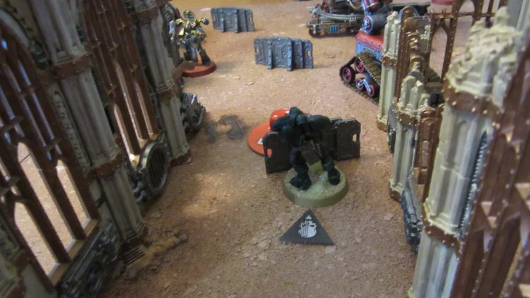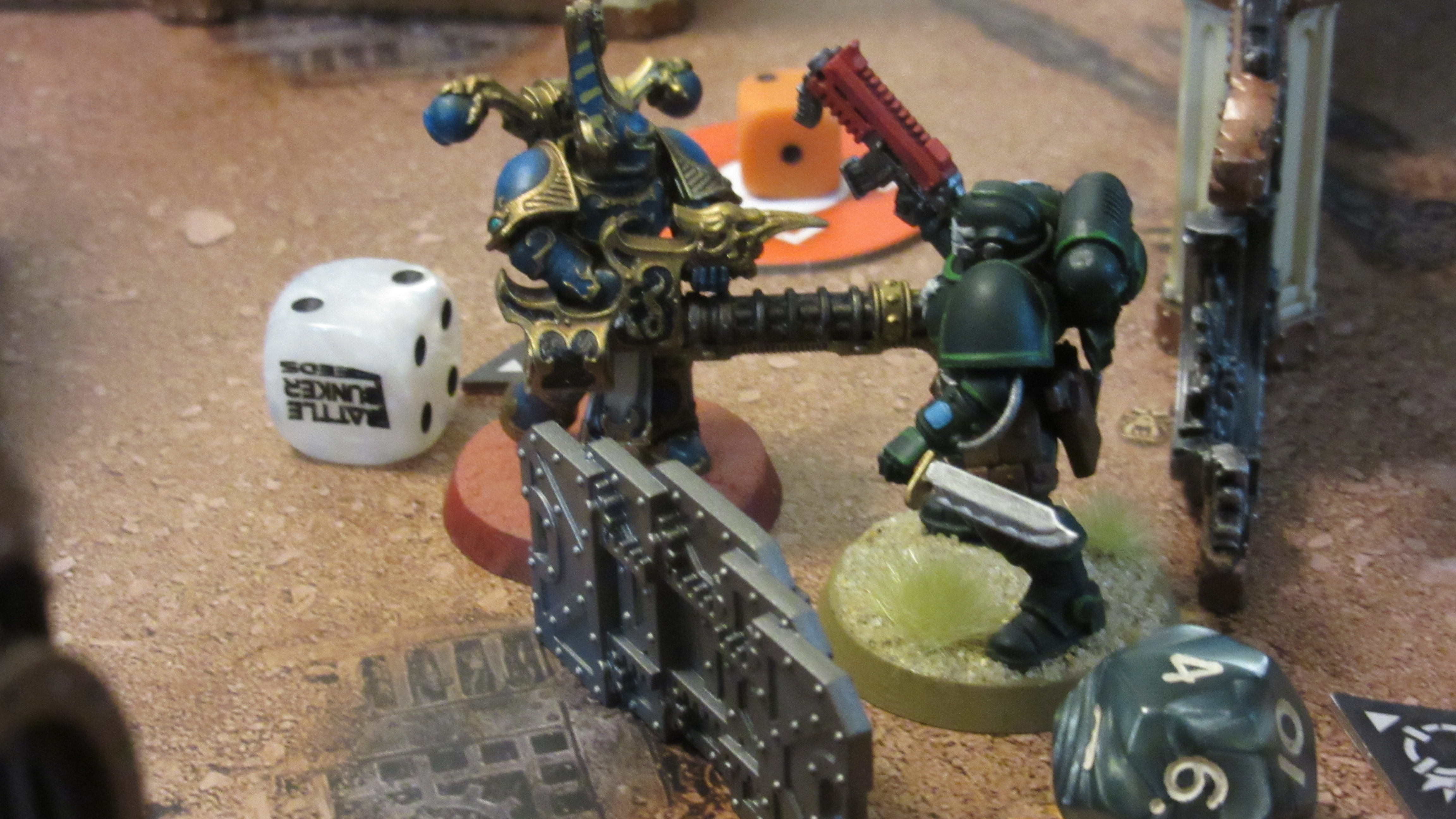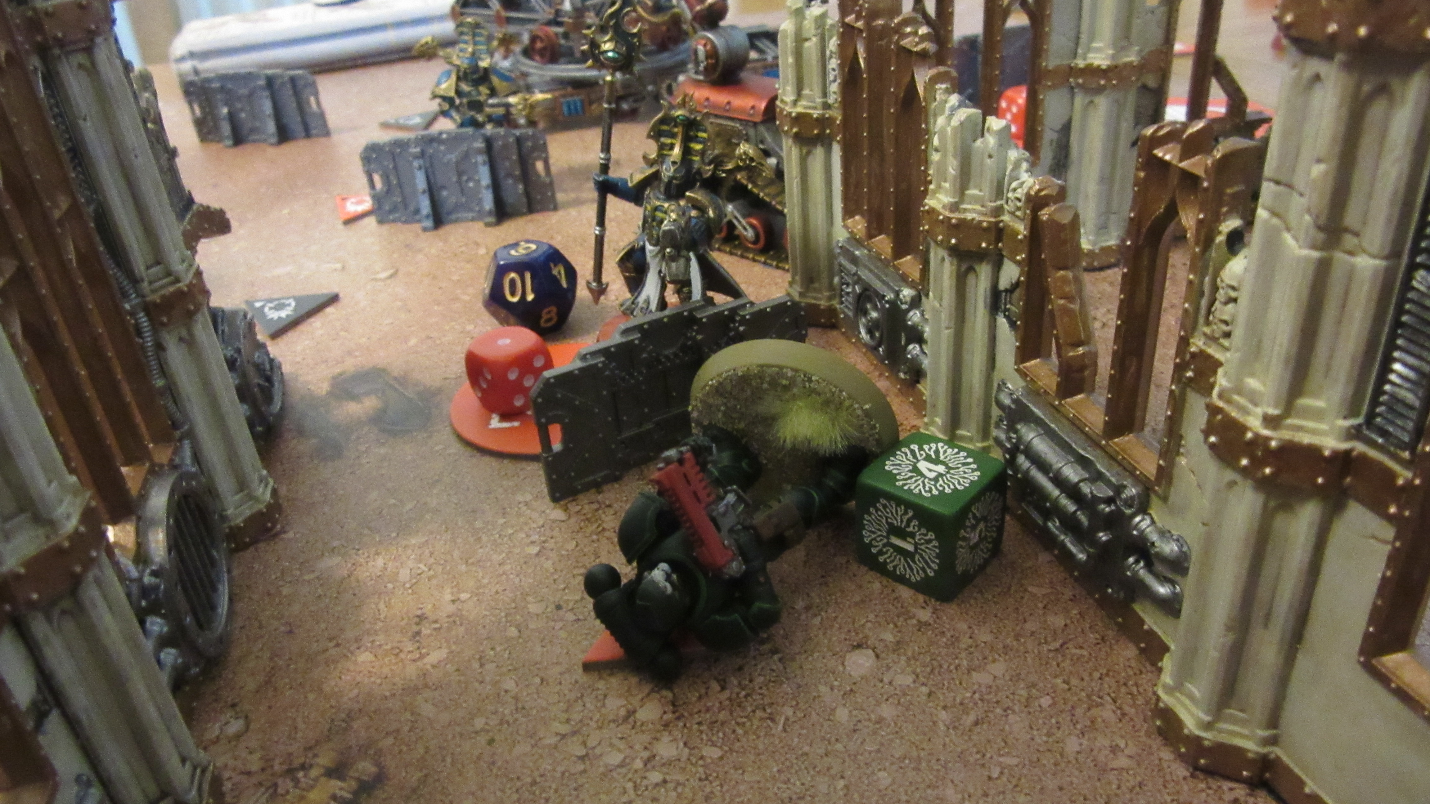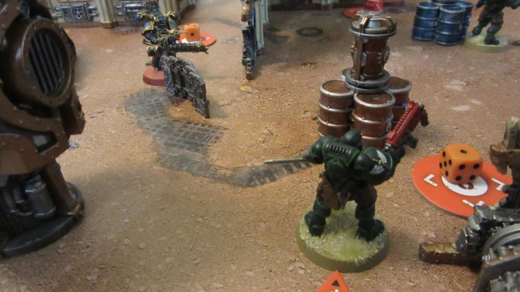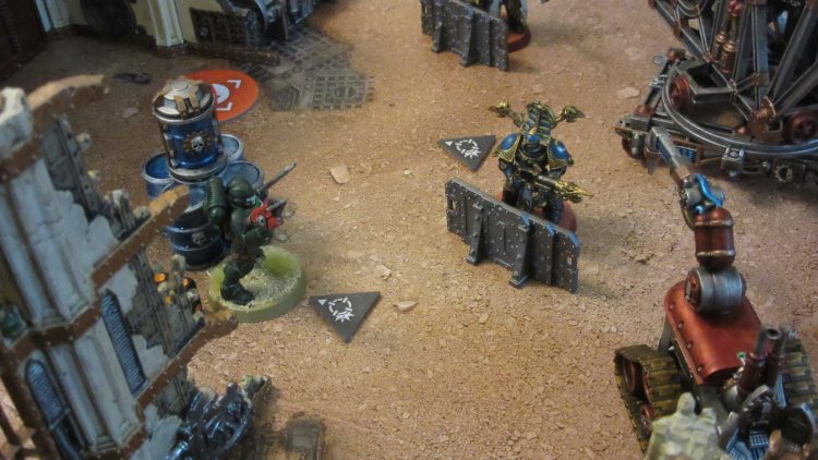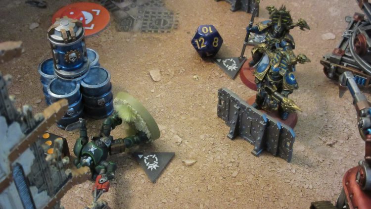 With the plan to cut off my scoring on the left not fully successful, the Aspiring Sorcerer had to go for a big play to turn things around, and stop my Marine behind the barricade grabbing any more points.