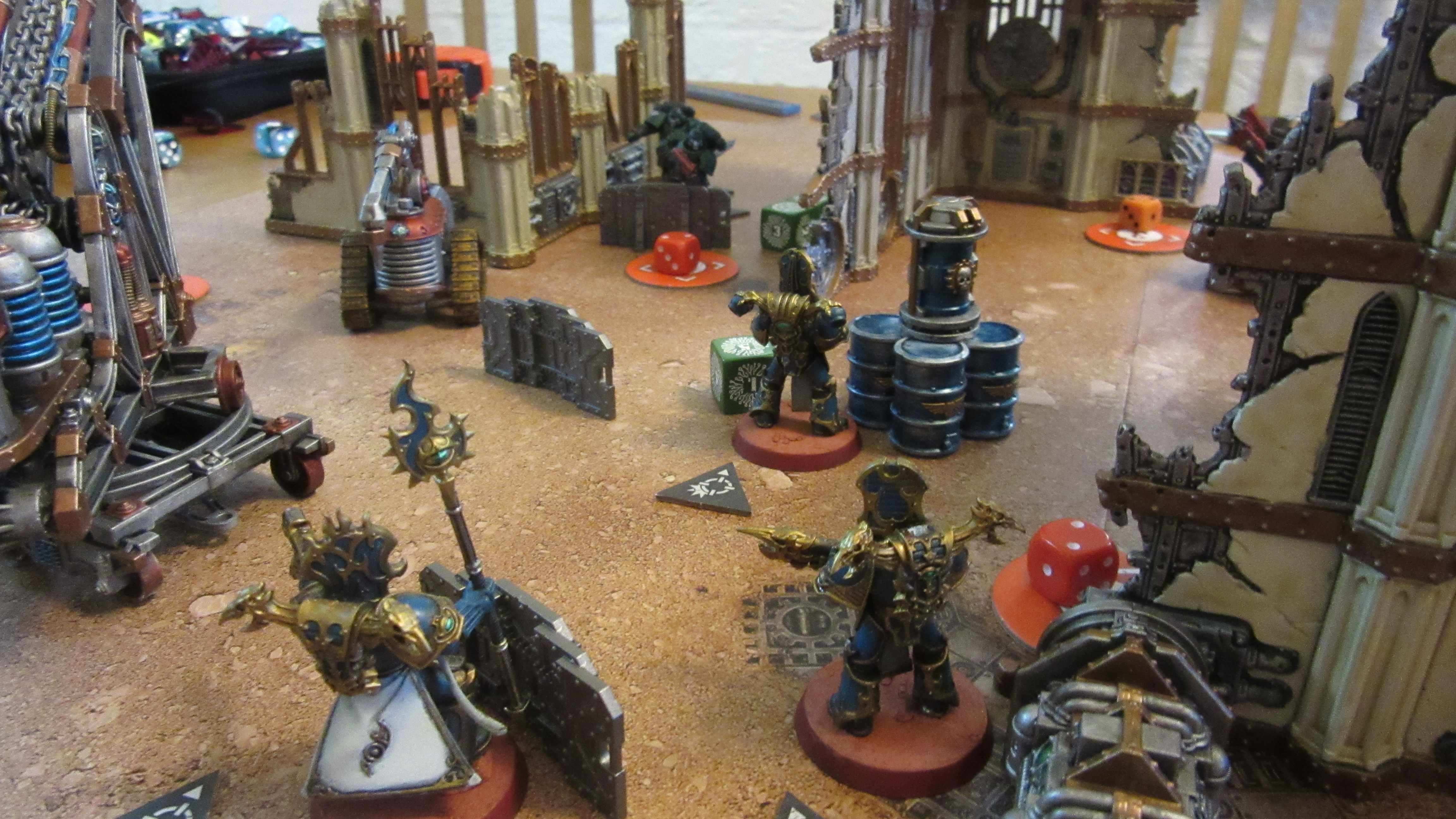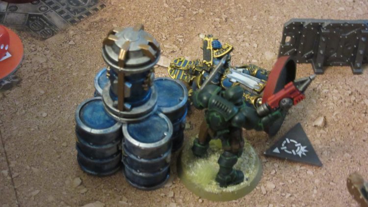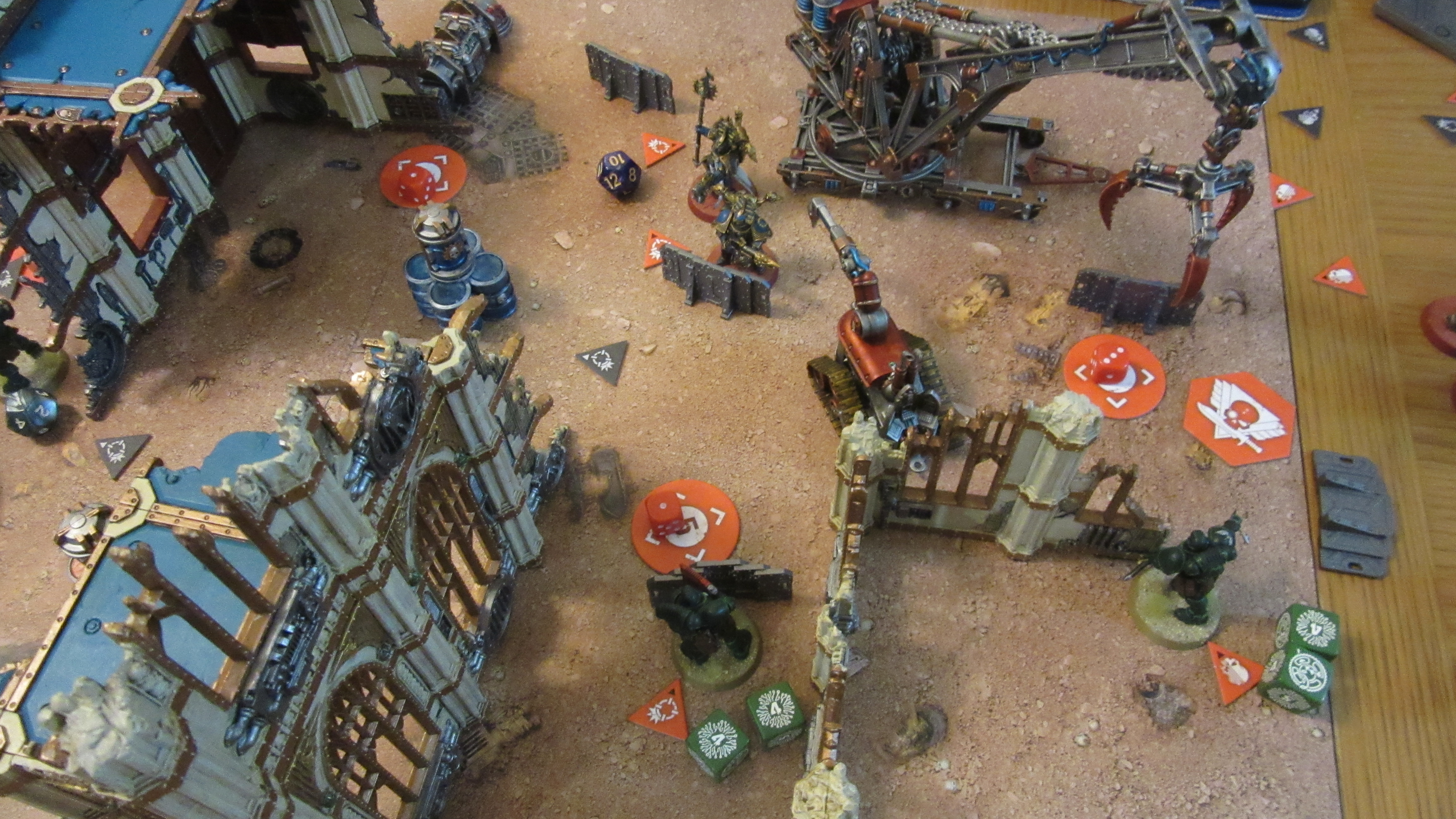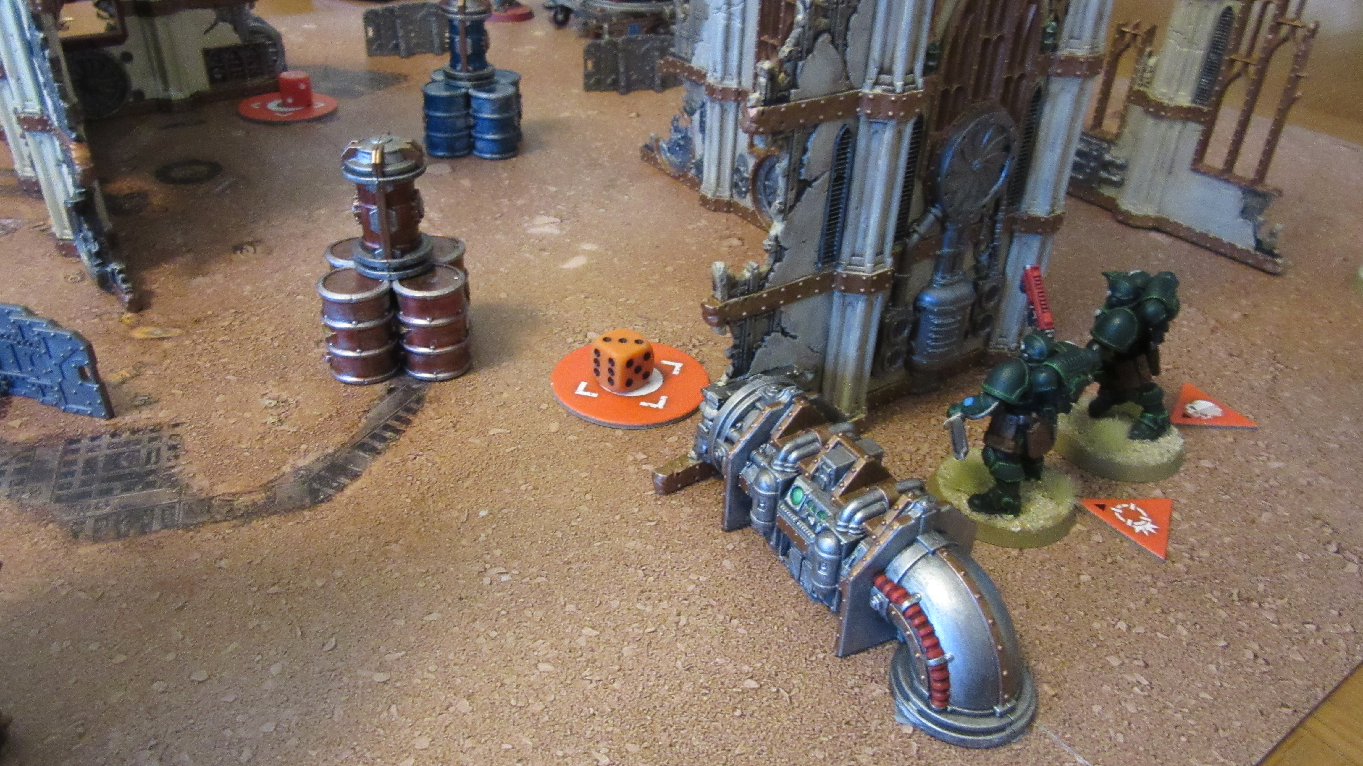 With the plan to cut off my scoring on the left not fully successful, the Aspiring Sorcerer had to go for a big play to turn things around, and stop my Marine behind the barricade grabbing any more points.