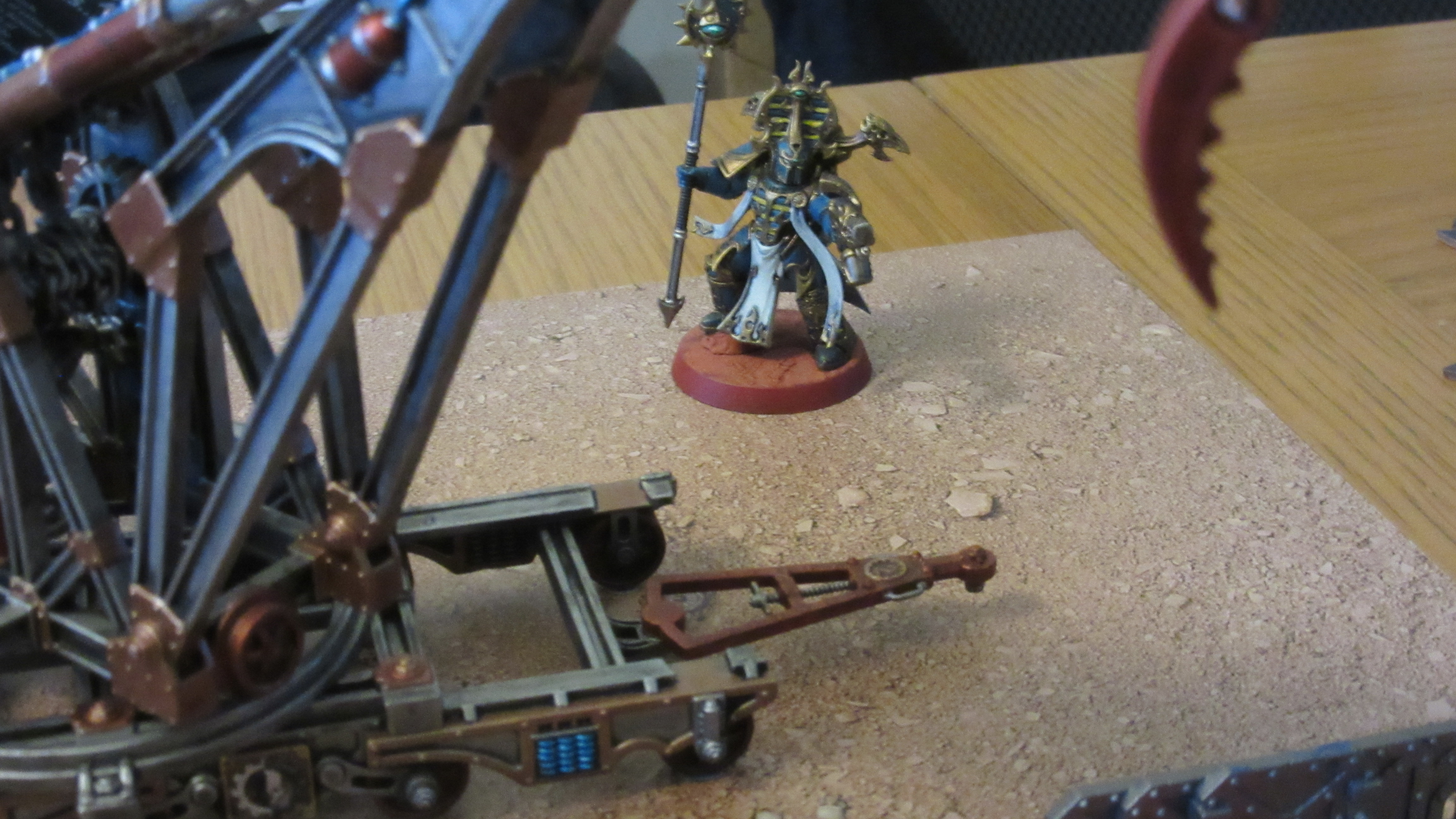 Figuring that attack was the best form of defence, and crossing my fingers that I could overcome the relatively weak melee of the Rubric my sergeant charged down the gunner in response and this paid off, with him being able to parry away the Rubric's strikes then land some fairly grievous blows, leaving both models badly wounded.