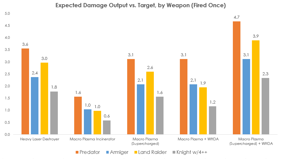 Surprisingly, the Dark Angels are well-positioned to use the Repulsor Executioner thanks to their Weapons from the Dark Age Stratagem, which turns the Macro Plasma Incinerator into a much stronger weapon; it's 1.75x better against hordes with its ability to average 7 shots each time it double-fires (and in regular charge mode), while supercharged with an additional +1 damage, it's suddenly a more effective weapon than the Heavy Laser Destroyer, and one with more upside (reminder: If you are using a CP reroll with the gun, the number of shots is the best place to use it).