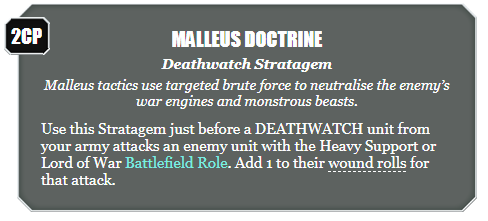 The first of these is the Malleus Doctrine, a 2 CP stratagem that gives a Deathwatch unit from your army +1 to its Wound rolls when shooting at a Heavy Support or Lord of War unit. This doesn't need a ton of explanation - functionally the two main guns on the Executioner already give you S9+ so against almost any target in the game, this gives you a 2+ on your To Wound roll, which is a significant increase in potency.