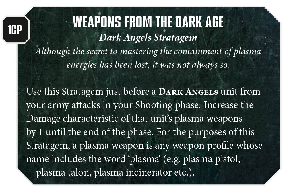 Weapons from the Dark Age turns the gun into a real powerhouse, and having the support of Azrael and a Lieutenant or Talonmaster can make a Macro Plasma Incinerator a powerful force on the battlefield. The plasma was already a better option against troops; by giving it +1 damage it becomes the superior weapon by a considerable margin; worth about 1 extra damage per volley against T7 targets and about half a point against the T8 targets. As a result, for the Dark Angels the Plasma Executioner is a much more versatile weapon, and cheaper by 8 points (though admittedly trading that cost for CP investment). The downside is that you can only use the stratagem once per turn; so we'd recommend having at most two plasma Executioners on the table at once.