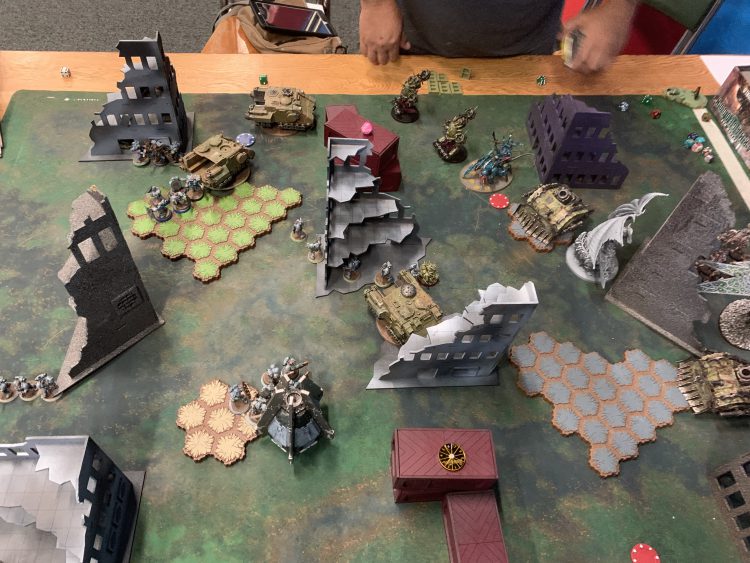 Turn 3 we have switched sides of the tableA very strong turn 1 for me, if not a little lucky. Jason was really feeling the pressure at this point and took advantage of a mistake I had also made which was deploying my incursors touching the ruin wall allowing his warglaives to fight me through it. Turn 1 he was unable to kill my long fangs in combat with his bullgryn meaning he was stuck there for another turn if that corner lived that long. The next turn saw me destroy everything that was in the top left corner (2 tuarox, 15 scions, 4 bullgryn, and his warlord) and then get into combat with one of his knights and kill that as well. Tough turn for Jason but he dropped everything he had and did what he could which was kill all my vanguard vets and an impulsor. I believe if he had played slightly more patient this would have been an extremely close game, this scions can do some serious work to marine bodies. Turns 3-5 saw us switching table sides and mostly just me hiding and running away from him while he chased me off objectives. I knew I had a strong lead and there was no need to go make any risky plays.