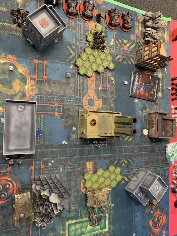 Wolves vs GscMy opponent, Richard had brought a fairly dangerous shooting list with not a lot in the way of combat. I felt very confident in how my list would play into this. I can dominate the mid objectives (they are extremely hard to hold as every objective was basically wide open: an immediate reminder of why online play is easier), and survive long enough to hit his lines without worry of counter combat removing me. I took Mission specific, Oaths of the moment, and ROD. I always try to take secondaries that do not require me to kill anything but be in places and hold things. I feel as though this requires my opponents to come to me to stop me from scoring 35-40 secondary points. I lost the roll and Richard proceeded to fire 2 tank commanders and do max damage with both of them, it was a very worrying start as 1 of my impulsors exploded and did max damage to my captain. He did however make the mistake of ordering his brood brother infantry up both sides of the table to get onto both of the objectives. This was now my way into the game, he has given my list a springboard.