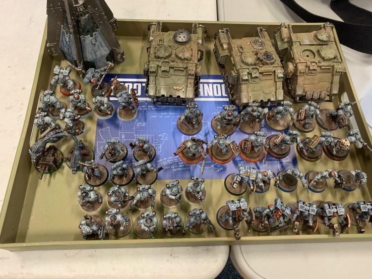 Jason Wells Covid ProjectThe final round I matched up against Another Brandon area local who runs one of the teams in town, Jason Wells. He is always a RTT top table player and usually somewhere in the hunt for top 5 of the GT/Majors we have around here. Jason was playing a mixed imperium list with 3 warglaives and a battalion of Lambion Lion Scions. The mission was, in my opinion pretty favourable for me as I would be able to bully 1 side of the table fairly easily if I just focus on my turn 1 target priority and remove the bullgryn/ move block the knights. I once again took Oaths, ROD and then banners this time. During deployment I was trying to get Jason to not deploy his knights in the center of his deployment and instead on one side or the other so my first 4 drops went corner to corner alternating, while also forward deploying my incursors onto both side objectives. by doing this I was hoping to force him to put 1 or 2 of his knights on one of those sides in an attempt to guarantee he removes the incursors. I was able to get what I wanted which meant I had now bought myself several turns of freedom on the other side of the table that I wanted to dominate anyways.