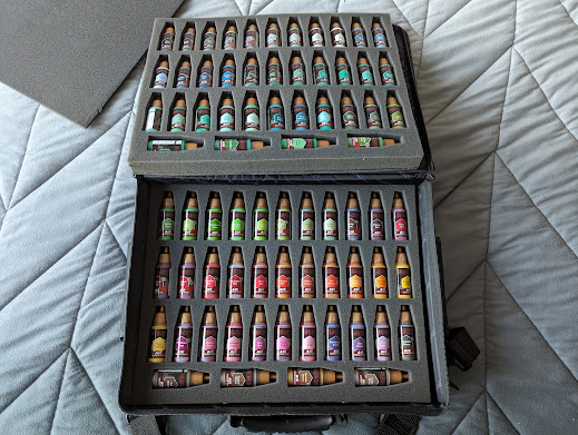 The other nice thing about the set is the sheer number of paints it includes. I've done several projects and only used maybe 10 of them. The variety of shades means that you don't have to do much mixing, which is great when you have to paint a lot of models with the same exact color scheme. I'm eager to give the metallic and fluorescent paints a shot.Part of what makes these work so well is that The Army Painter's air paints come pre-thinned in easy-to-use dropper bottles. The latter are a godsend when feeding paint into the airbrush. As mentioned the downside here is that paints require a good shake before using, but the bottles themselves come with a metal mixing ball in every bottle that helps speed up this process.