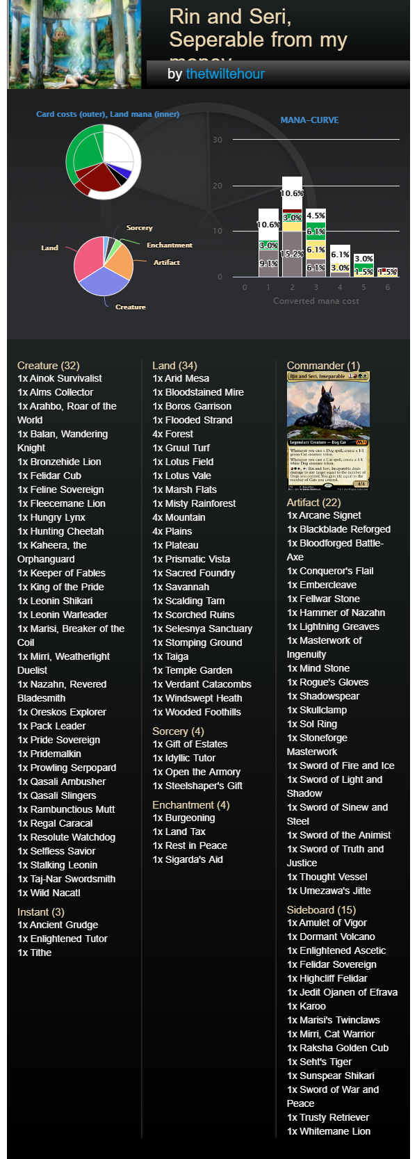 It's up to you how strict you want to be on "tribal cats;" the definition is somewhat fluid. The OMG KITTIES! included Mirri, Weatherlight Duelist, which is decidedly in cat-person, not cat, territory, you could say even legendarily so. Rin and Seri, Inseperable though are pretty clearly just normal cats and dogs. But for the purposes of this deck I chose to include various cat-persons, in the interest of making the deck more functional and build some internal synergy.