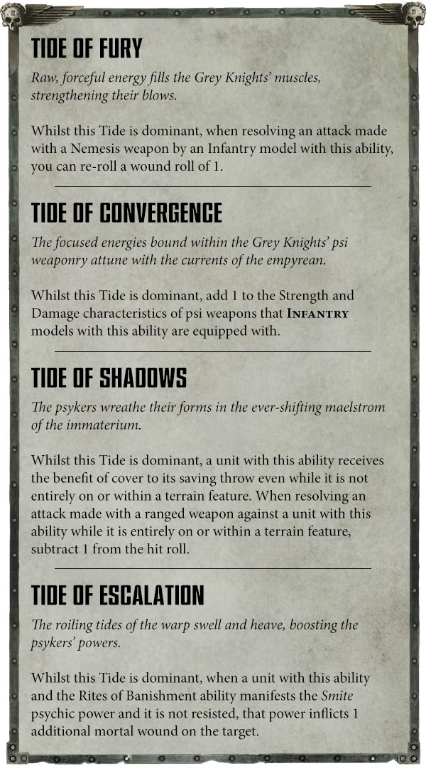 Well, three of them are anyway. Tide of Fury is fine but I think it will probably be the least frequently activated just because the effect is a bit more marginal than the others - if your Grey Knights are in amongst the enemy in sufficient numbers for it to be really good, then you’re probably already in a pretty great place in that game and aren’t likely to need the help. You might still sometimes want to put it up at the end of the psychic phase if your good shooting units are gone and you’re hitting combat.