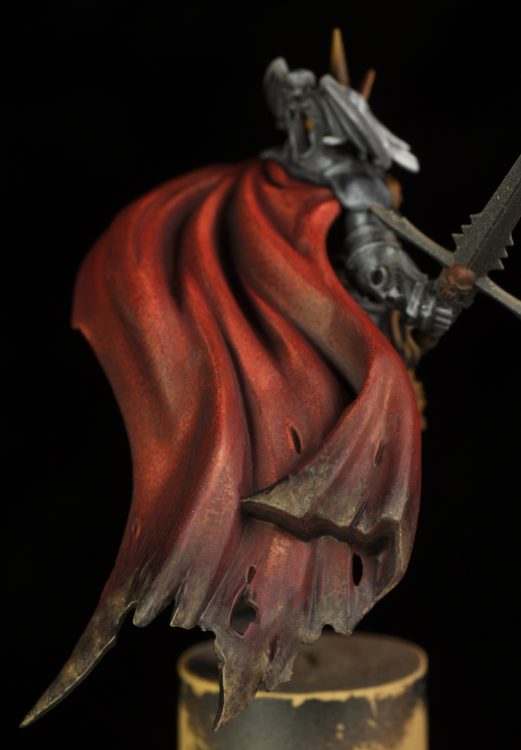 Most of the progress has been on the cape. This one is from the Chaos chariot kit and felt like it had the right amount of movement for this build. There was cutting, sanding, and a little green-stuff work to get the cape flying at the angle I wanted. To begin with I gave the whole thing a coat of Khorne Red. The bottom quarter had a second coat of Incubi Darkness and Khorne Red mixed together, then a wash of watered down black along the very bottom. Highlights were built up from Vallejo Bloody Red to Wild Rider Red. That all went fairly quickly. The rest didn't.