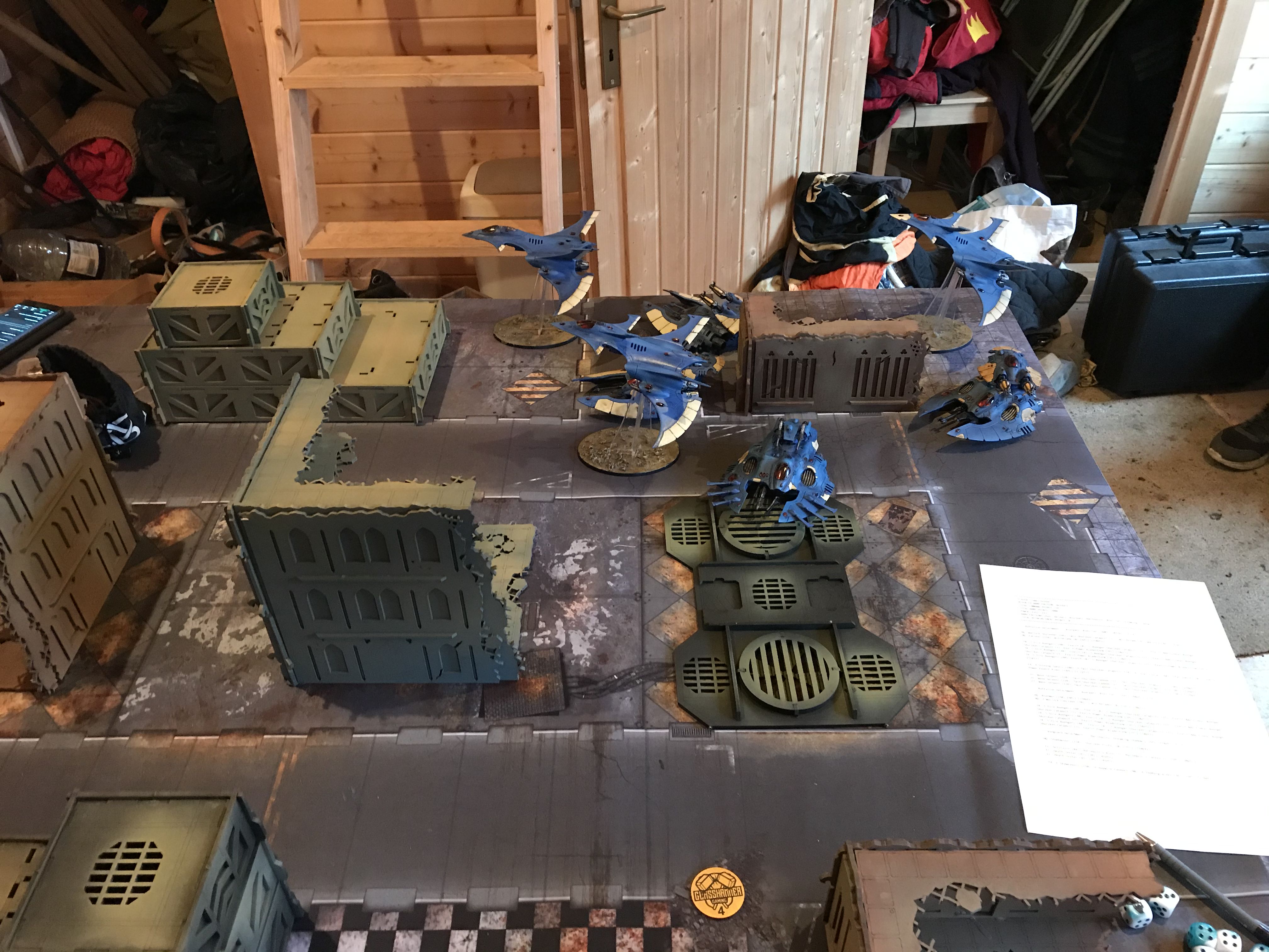 By the end of last week I was in a bit of a panic about my updated list - I was pretty sure it was good, but worried that it would turn out to be somehow unplayable on the table. Luckily, when I sent a desperate message to Doug, he stepped right up to the plate and came round packing a full set of LGT terrain and a nasty Eldar list to throw down with.
