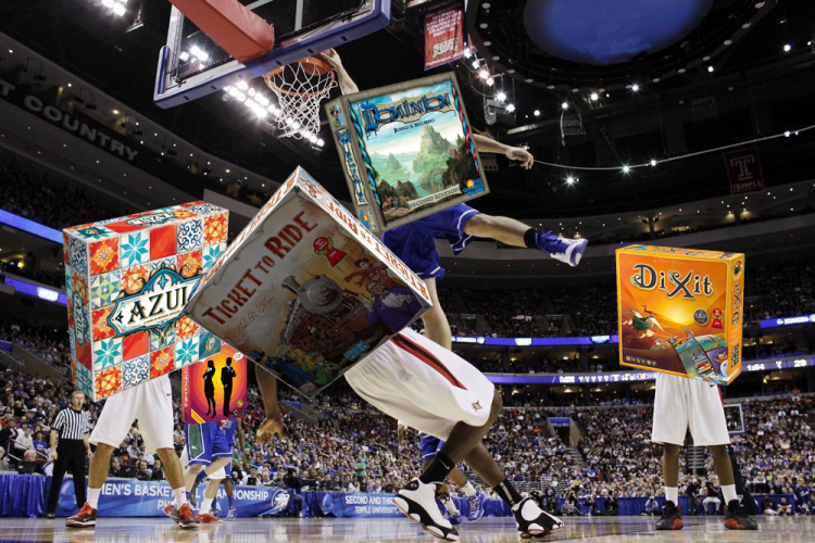 In the top half of this region, Dominion and its fans start booking their accommodations for the Sweet 16 while Mississippi Queen is still getting its paddle spinning. Dominion created a revolutionary mechanism and continues churning out expansion for those who just can't get enough card shuffling. In the other match up, Colt Express is going to win. You know how the camera pans to old former players in the middle of a game, listing the years they played for the team? That's Thurn Und Taxis. Great in its day, and still a game that's going to give you a good time, but the game has moved on. Also trains. And crimes. And Train Crimes.Down below we have another interesting match-up between Dixit and Elfenland. Both are cute, approachable, and family friendly. Dixit takes this one however; the art is beautiful and it was the in the vanguard of popular games expanding beyond things like boards and spaces and efficiency. It's a 'party game', but a creative one. It's also inspired a whole bunch of other great games like Mysterium or When I Dream. Carcassonne is going to roll past Hare & Tortoise and easily dispatch Dixit in the Elite 8, setting up yet another titanic clash. Where Azul vs Catan was a battle of old vs new, Carcassonne and Dominion are more recent classmates.