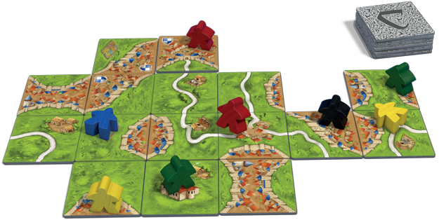 There is a common theme among the best of the Spiel de Jahre winners. Many of these games are easy to learn and play in a light casual manner, and then get table-flippingly mean once you've got a few games under your belt. Azul's got hate drafting, Dominion expansions introduce curses, but perhaps no game exemplifies this like Carcassonne. It's a game where you will lovingingly build a serene landscape of farms, cities, and chapels over the course of 30 minutes or so only to have that asshole friend of yours deliberately cut off your scoring in a move that tanks you and does nothing for them.All of Carcassonne fits in a large bag. On your turn you'll reach in and grab your fate. The tile you grab is added to a large communal landscape that everyone builds together. These tiles feature roads, city walls, and various other elements that all contribute to scoring. Scoring is notably the most complex part of Carcassonne and will take a while to wrap your head around, but its also what makes this game so fun.